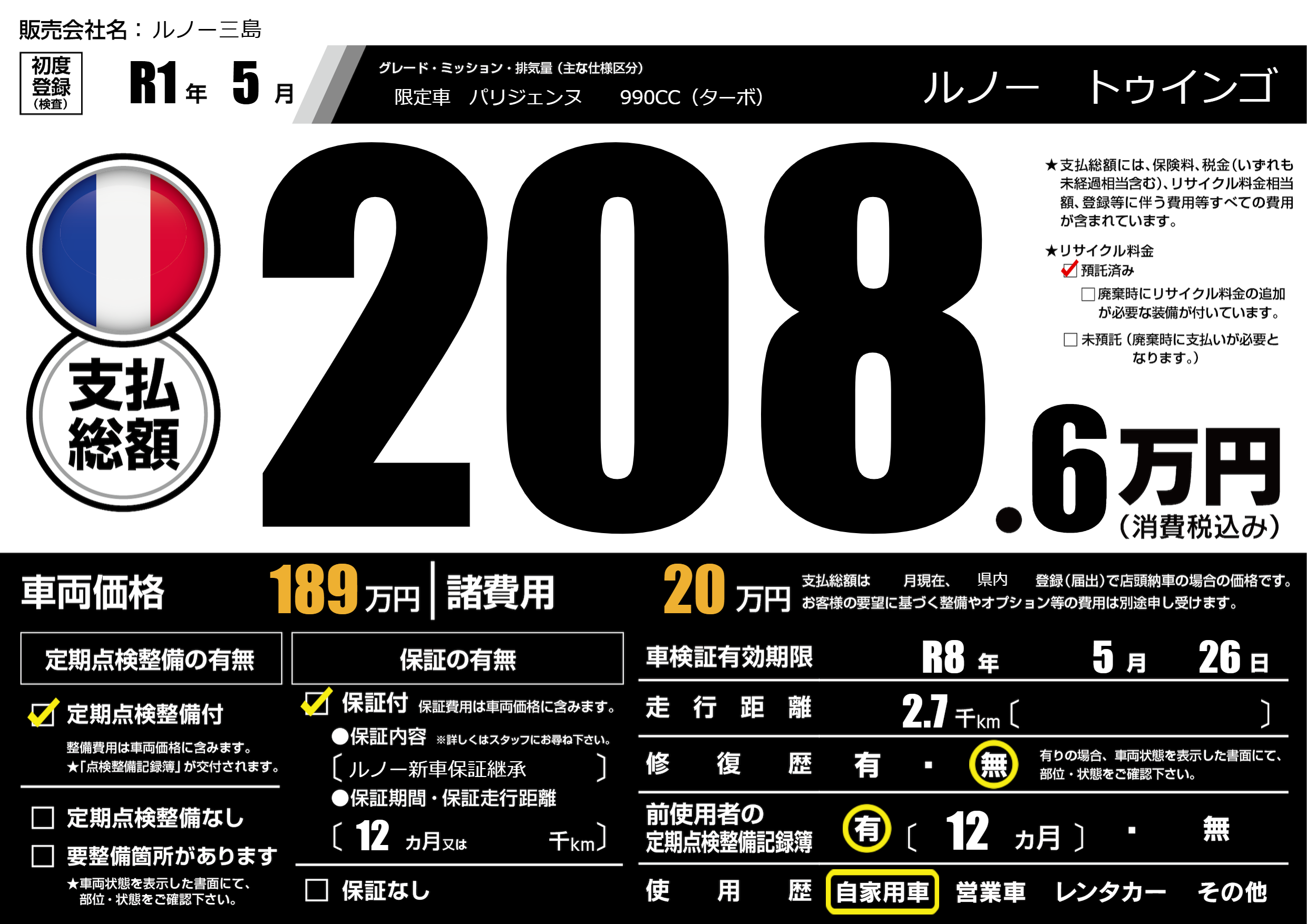 | 車名 | ルノー トゥインゴ | グレード ミッション 排気量 |