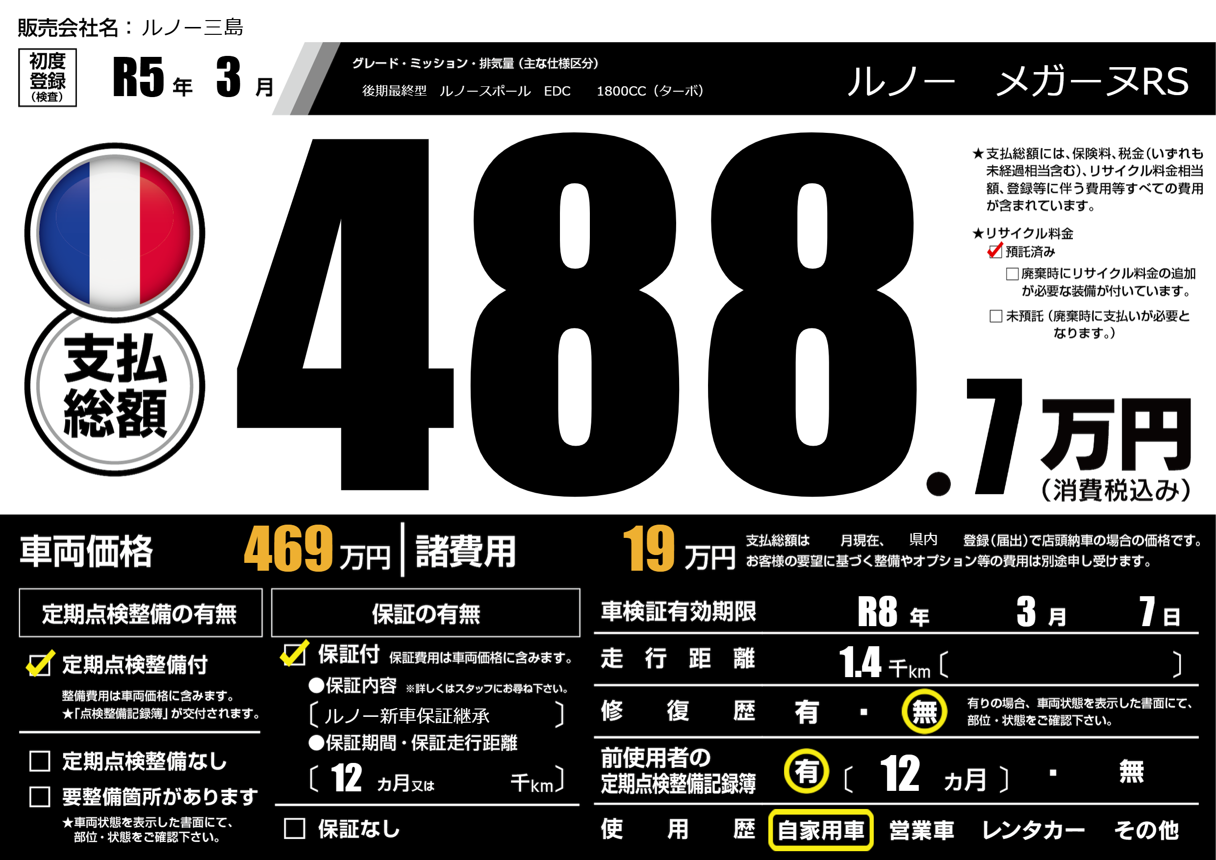 | 車名 | ルノー メガーヌRS | グレード ミッション 排気量 |