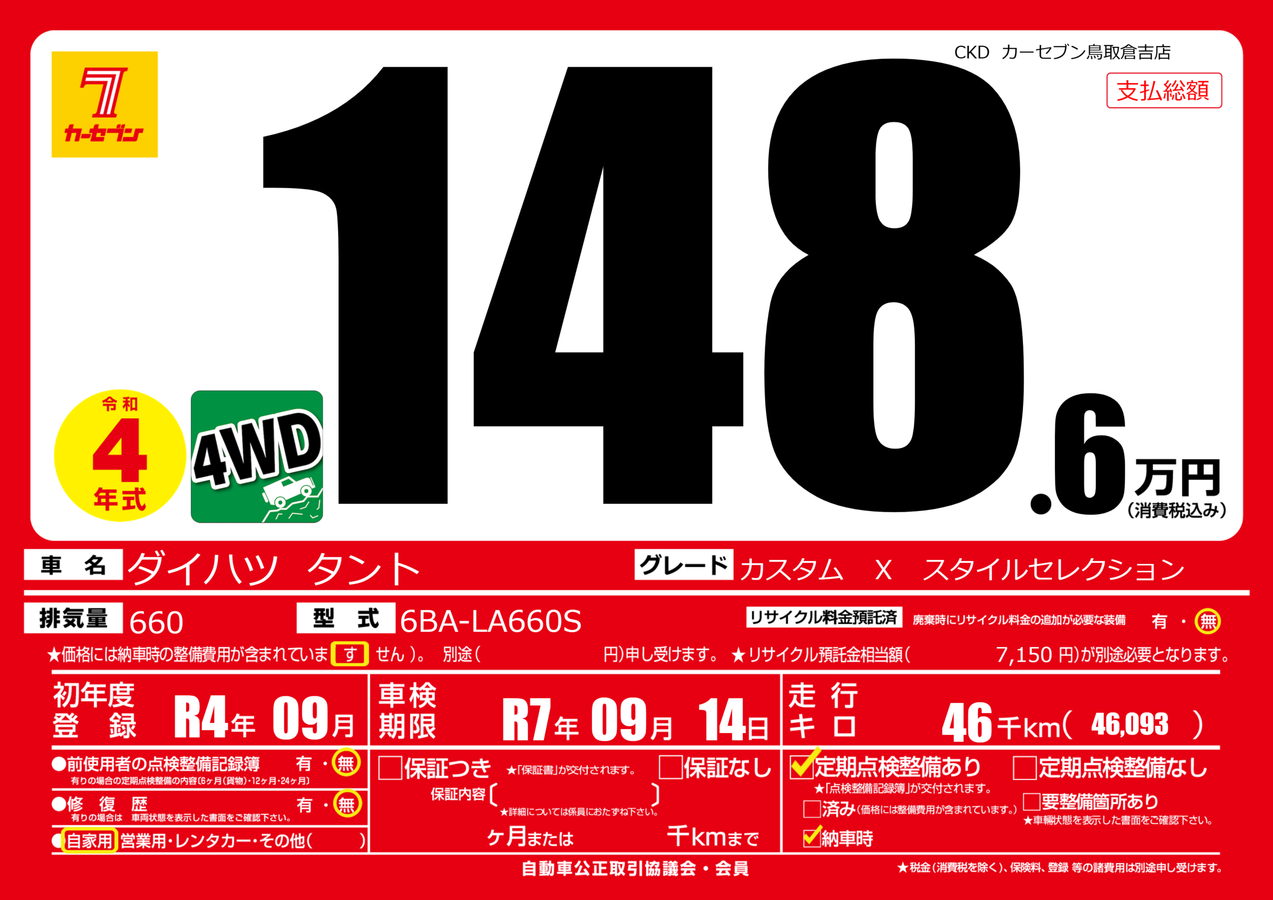 | 走行キロ | 4.6万km | 初年度登録 | R4年09月 |