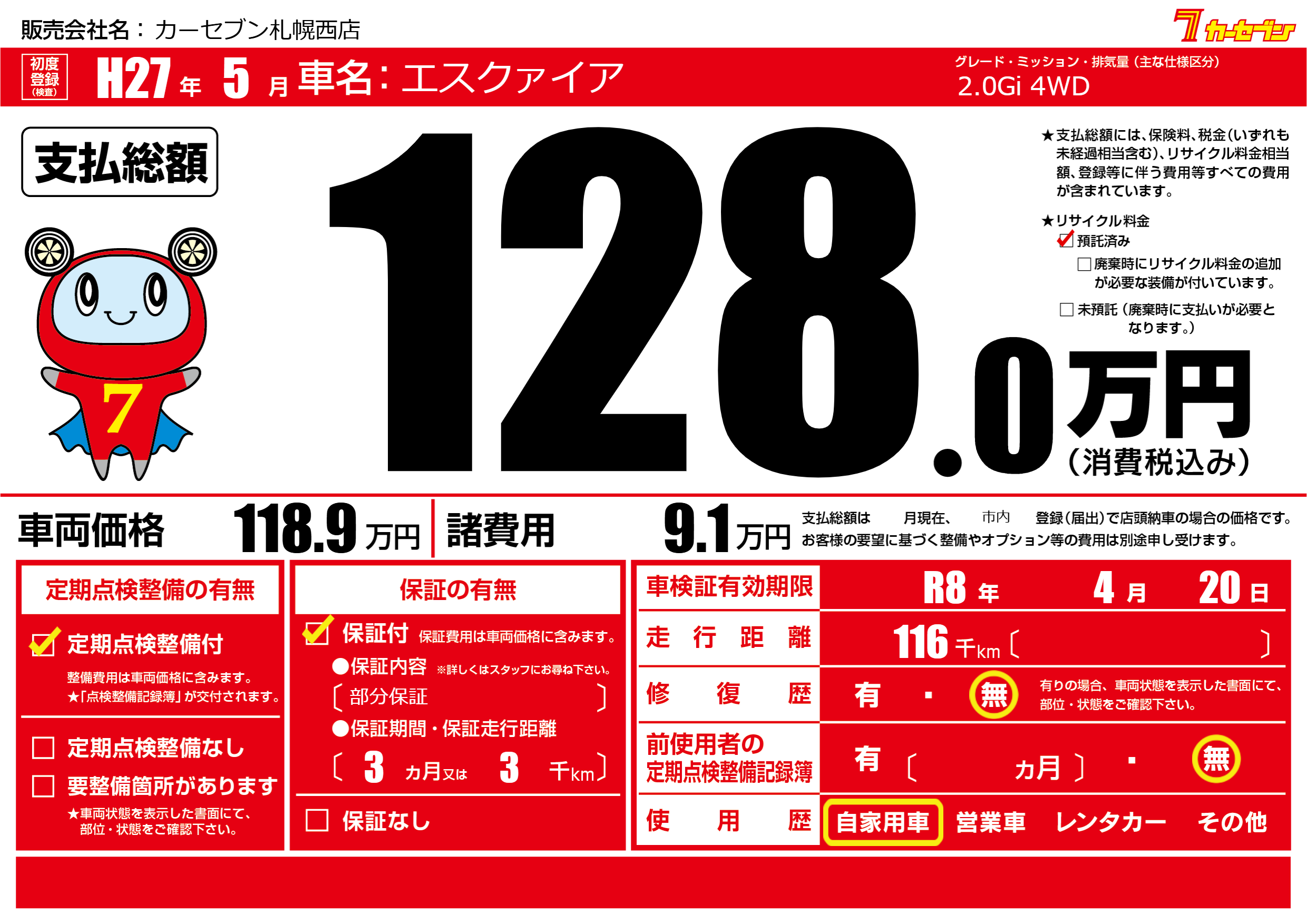 | 走行キロ | 11.6万km | 初年度登録 | H27年5月 |