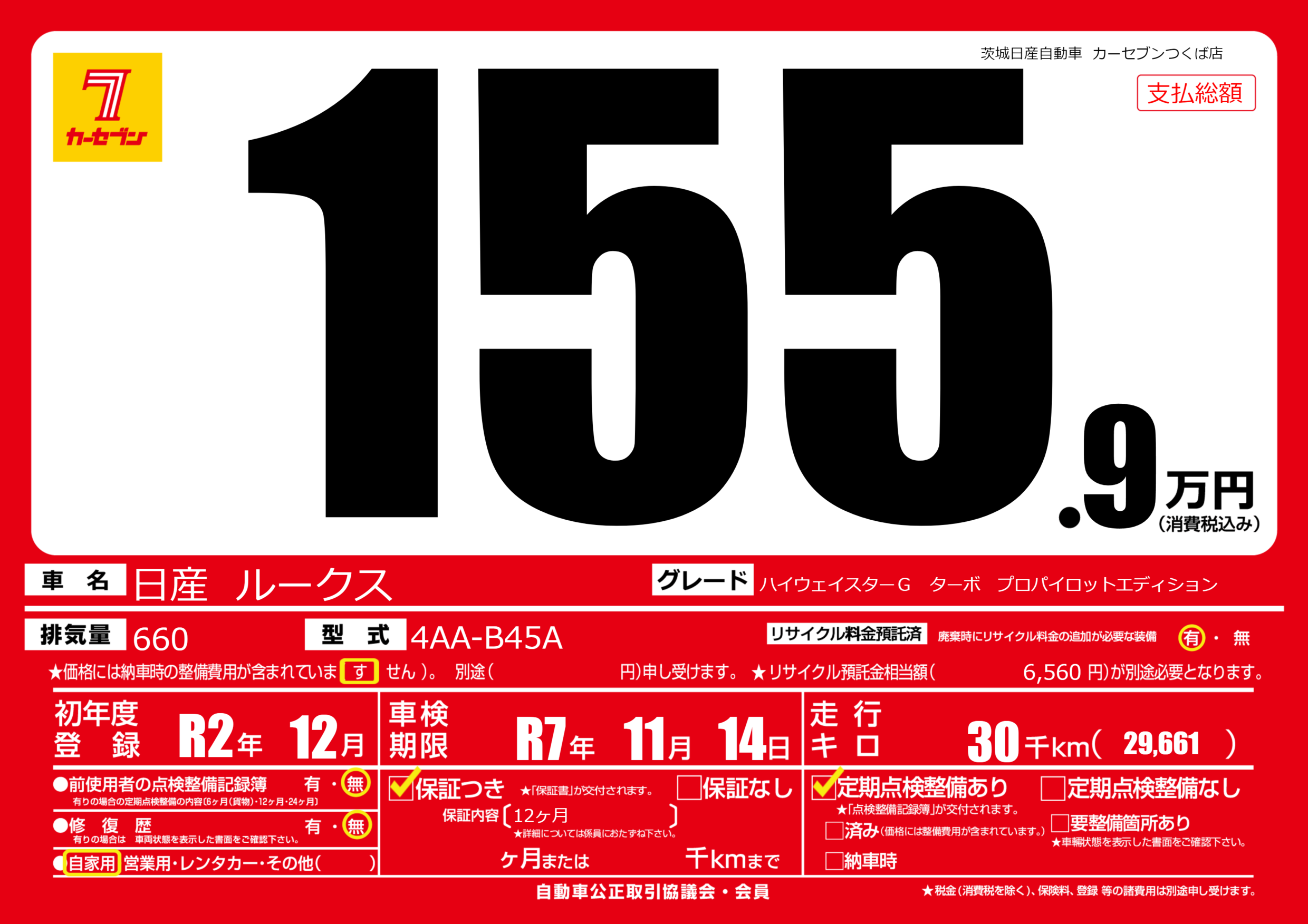 | 車名 | 日産 ルークス | グレード ミッション 排気量 |