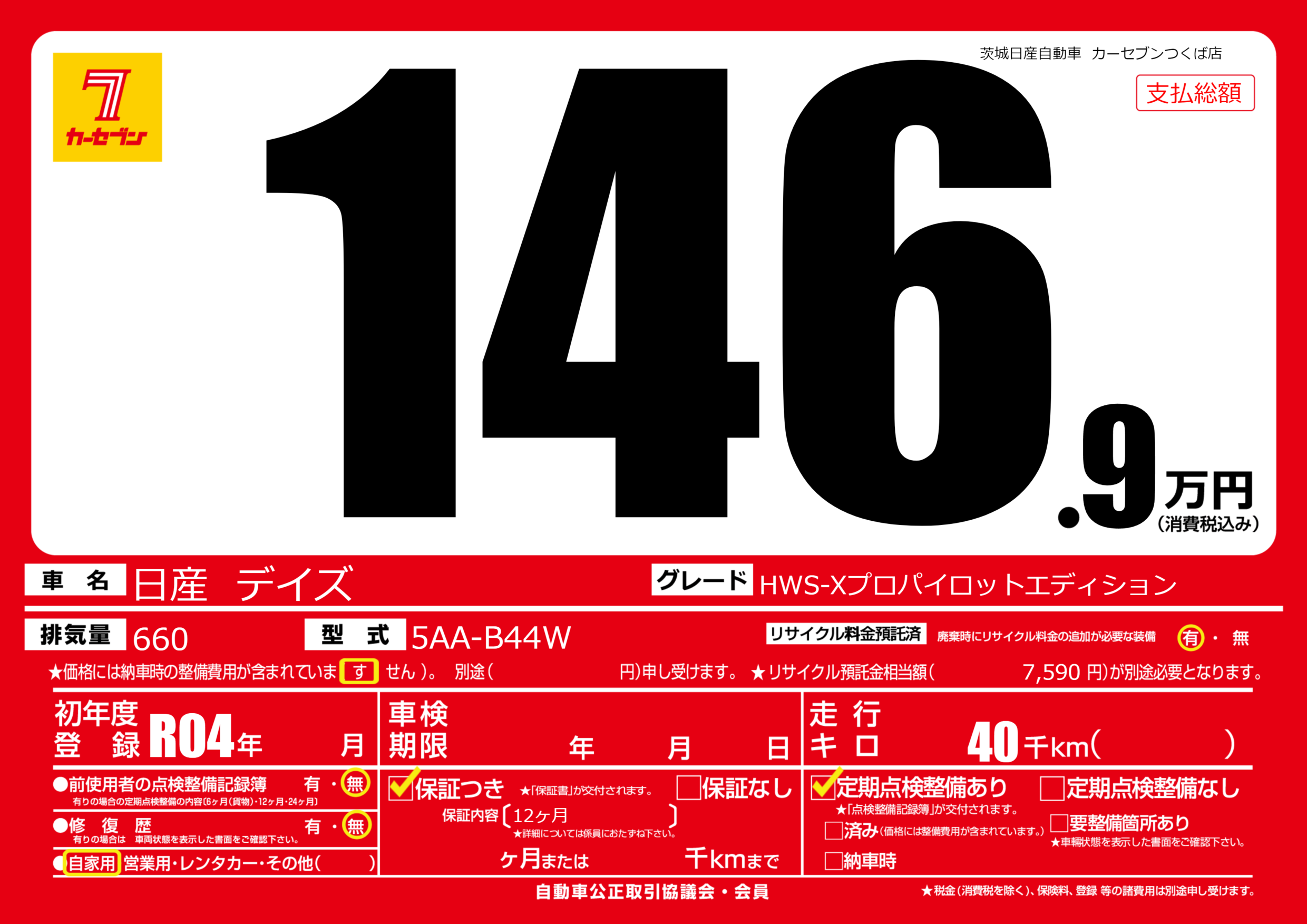 | 車名 | 日産 デイズ | グレード ミッション 排気量 |