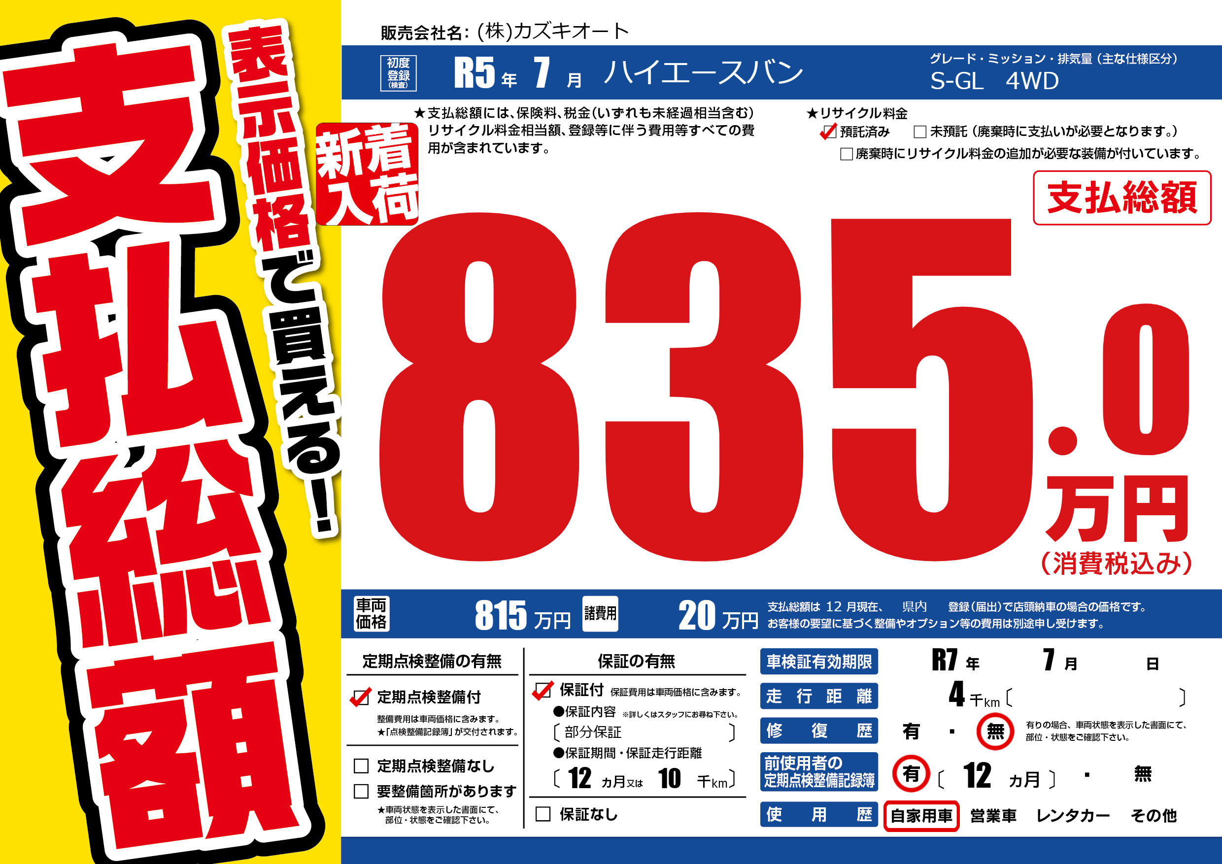 | 走行キロ | 0.4万km | 初年度登録 | R5年7月 |