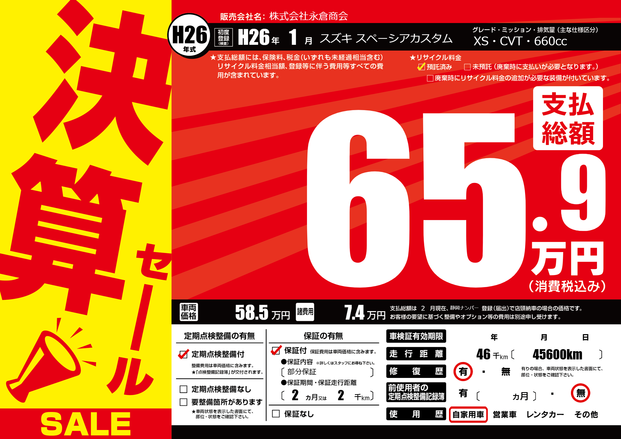 | 走行キロ | 4.6万km | 初年度登録 | H26年1月 |