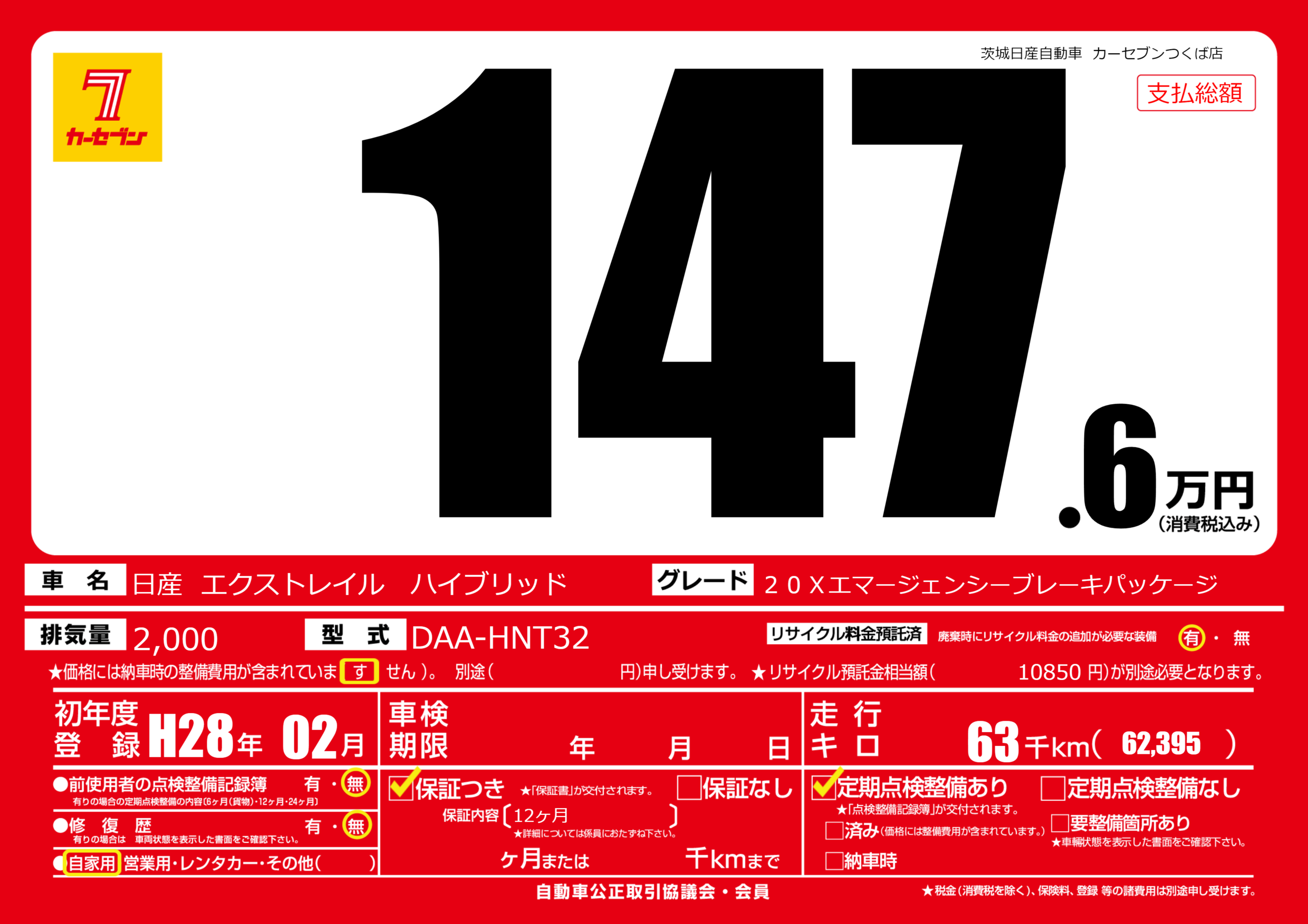 | 車名 | 日産 エクストレイル ハイブリッド | グレード ミッション 排気量 |