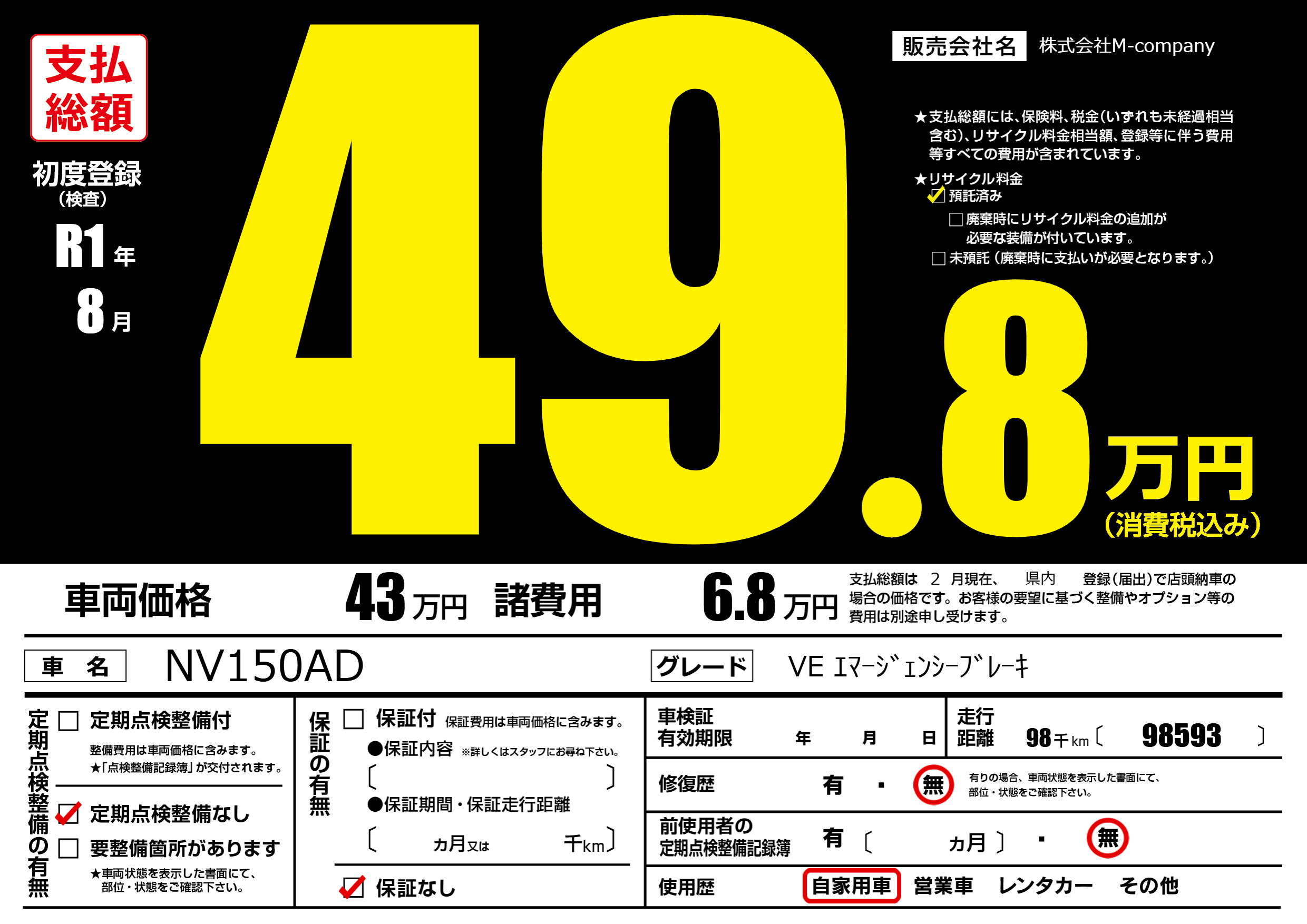 | 定期点検整備 | 定期点検整備なし | ||