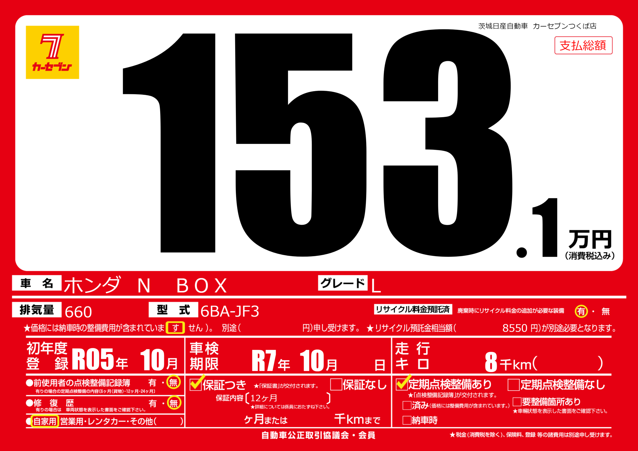 | 走行キロ | 0.8万km | 初年度登録 | R05年10月 |