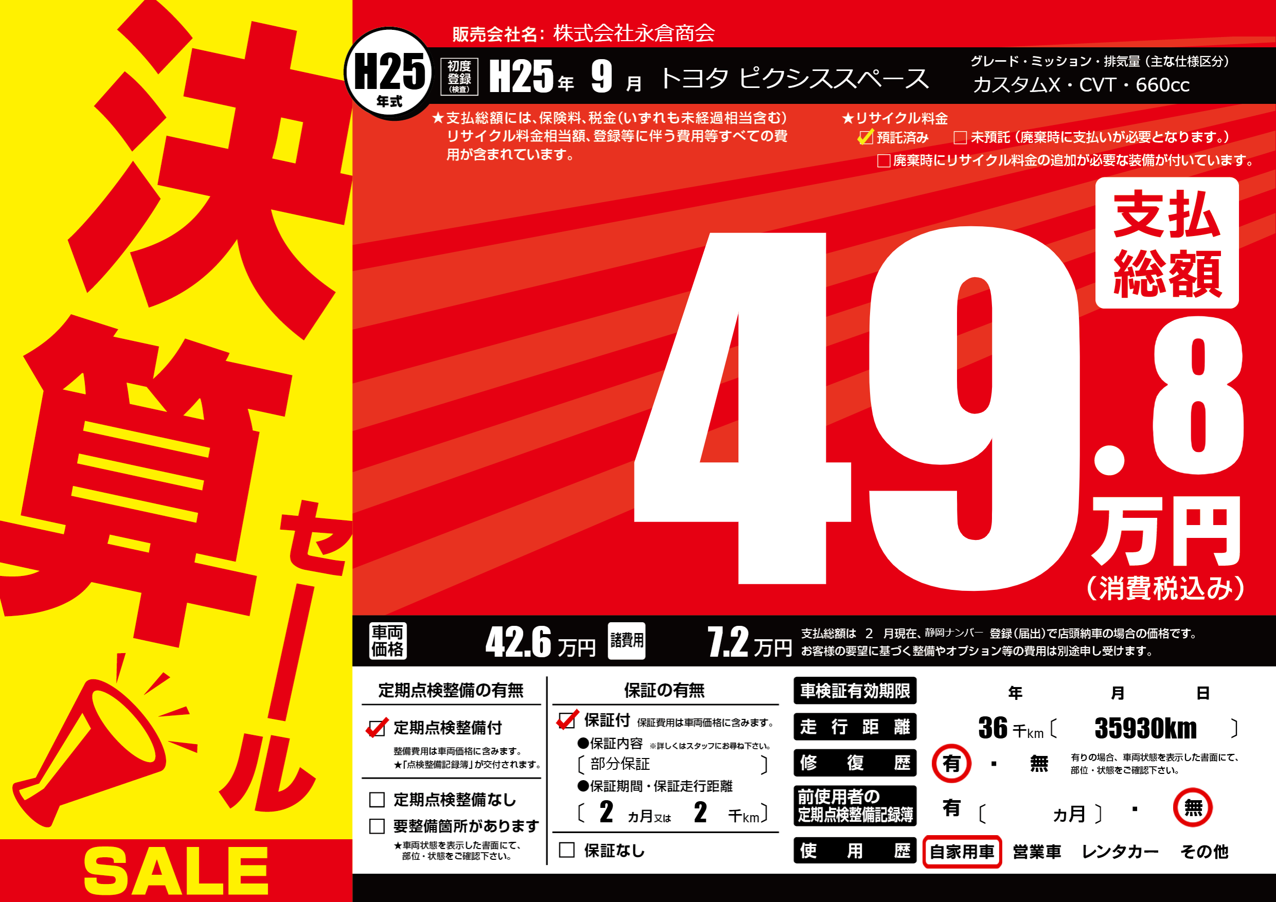 | 車名 | トヨタ ピクシススペース | グレード ミッション 排気量 |