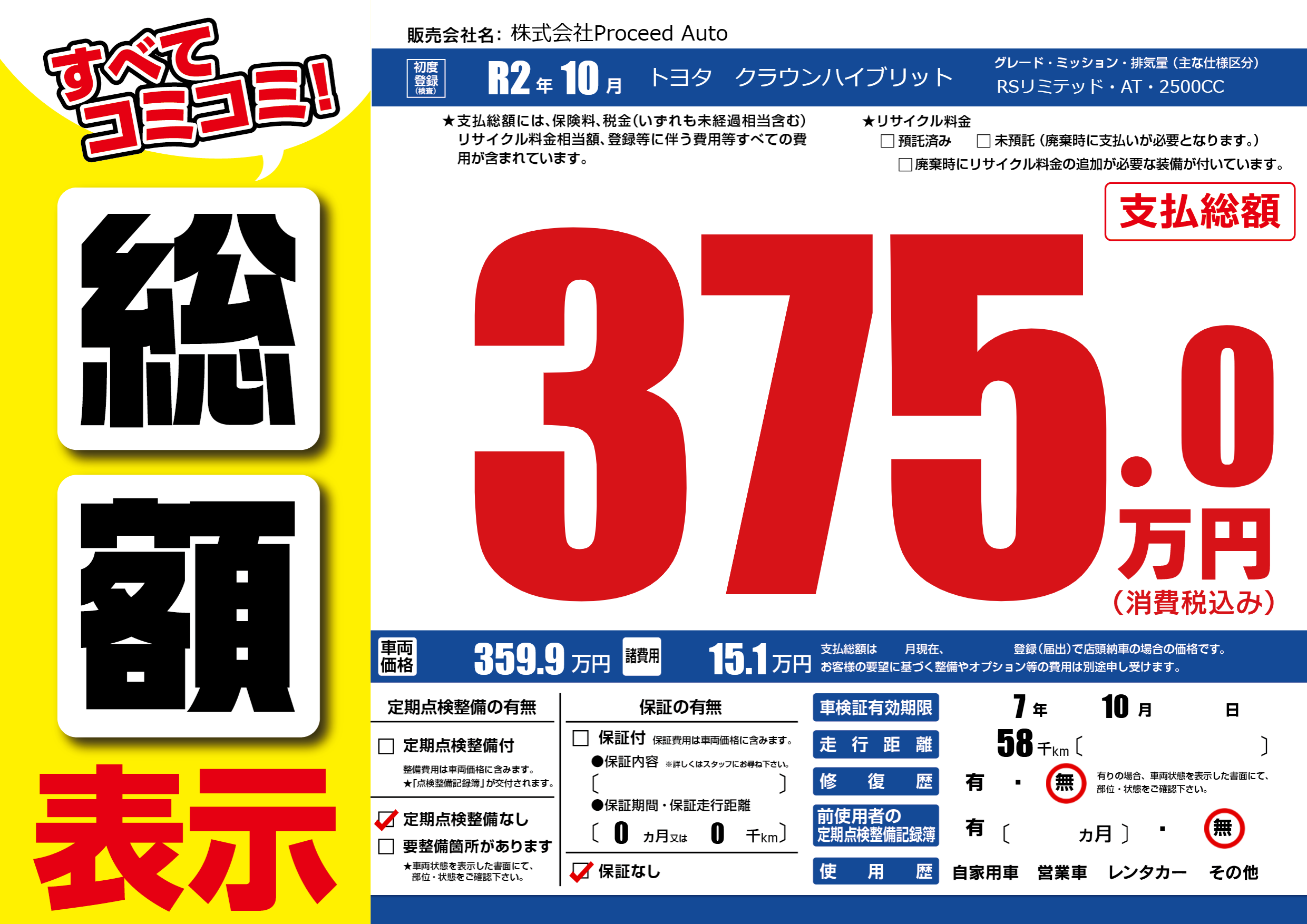 | 車名 | トヨタ クラウンハイブリット | グレード ミッション 排気量 |