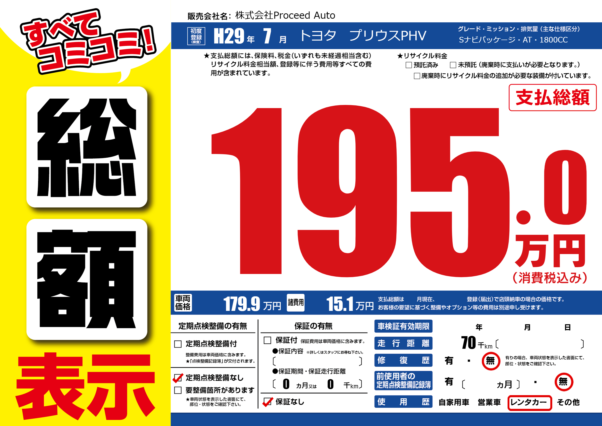 | 車名 | トヨタ プリウスPHV | グレード ミッション 排気量 |