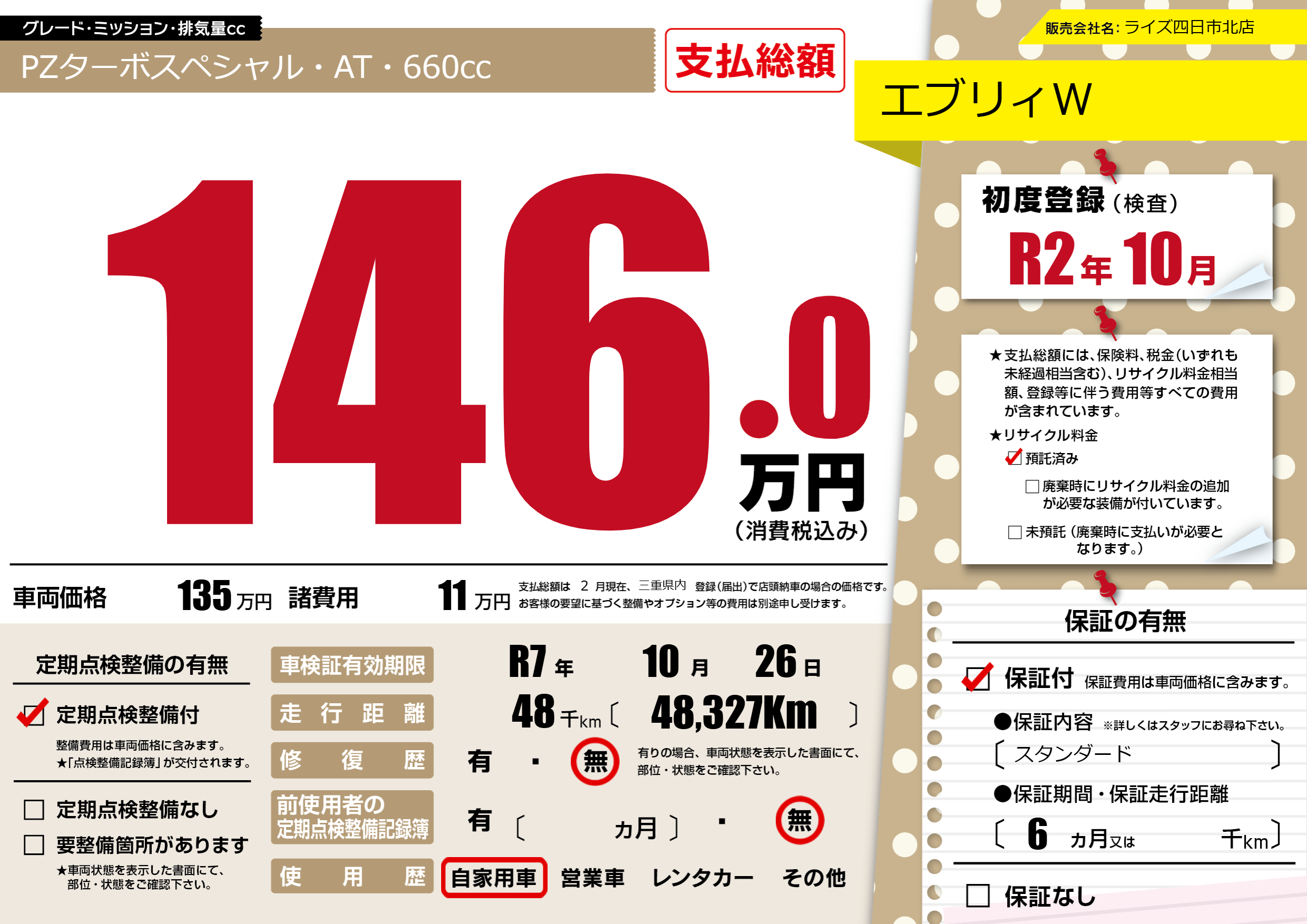 | 車名 | エブリィW | グレード ミッション 排気量 |