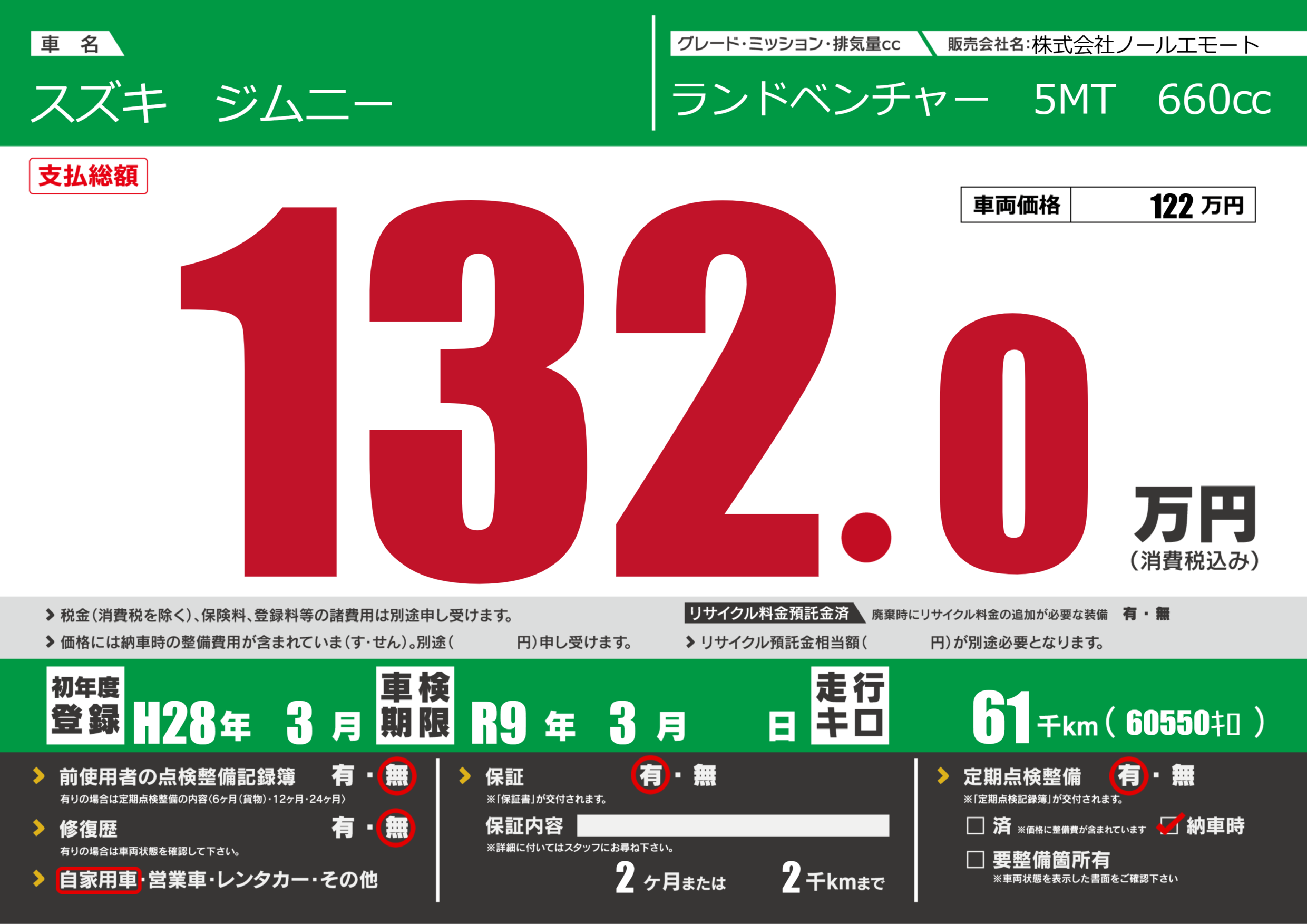なし | 車検制限 | R9年3月---月 |
