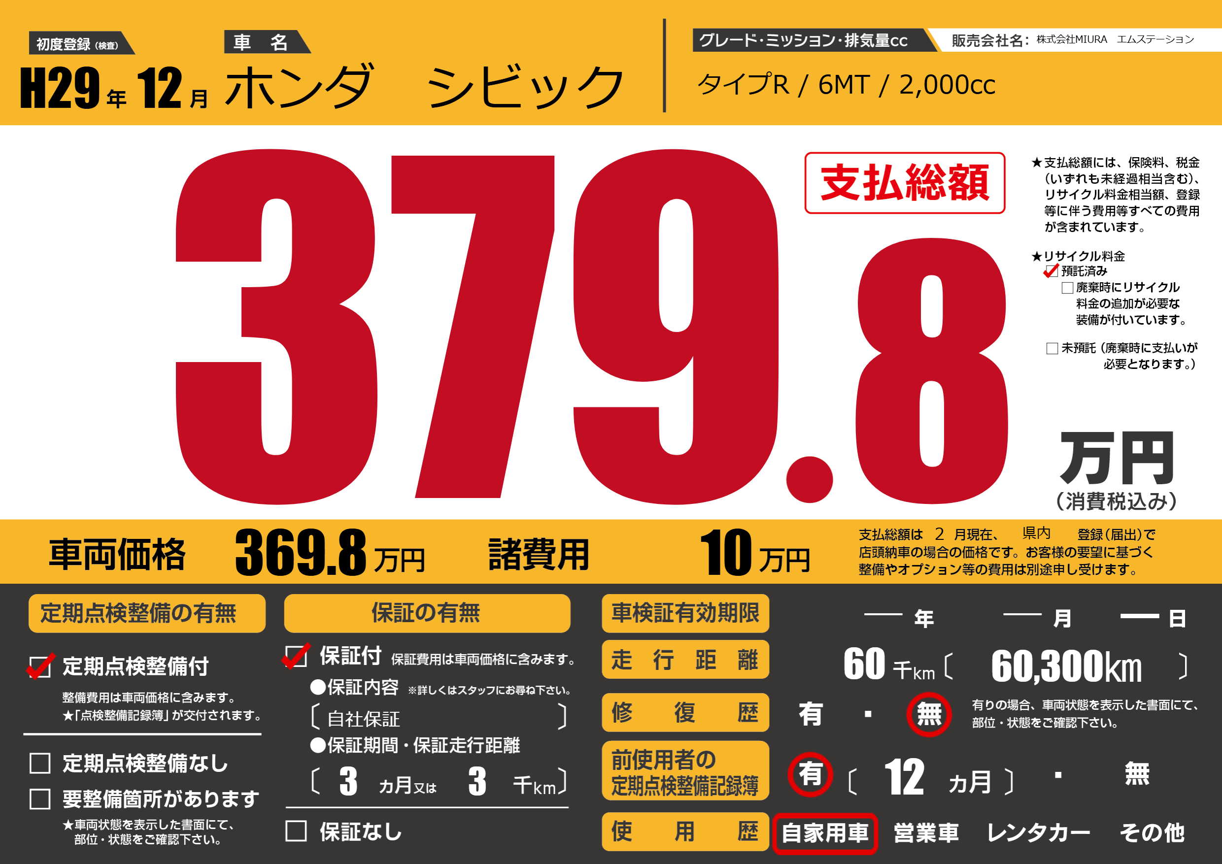 | 車名 | ホンダ シビック | グレード ミッション 排気量 |