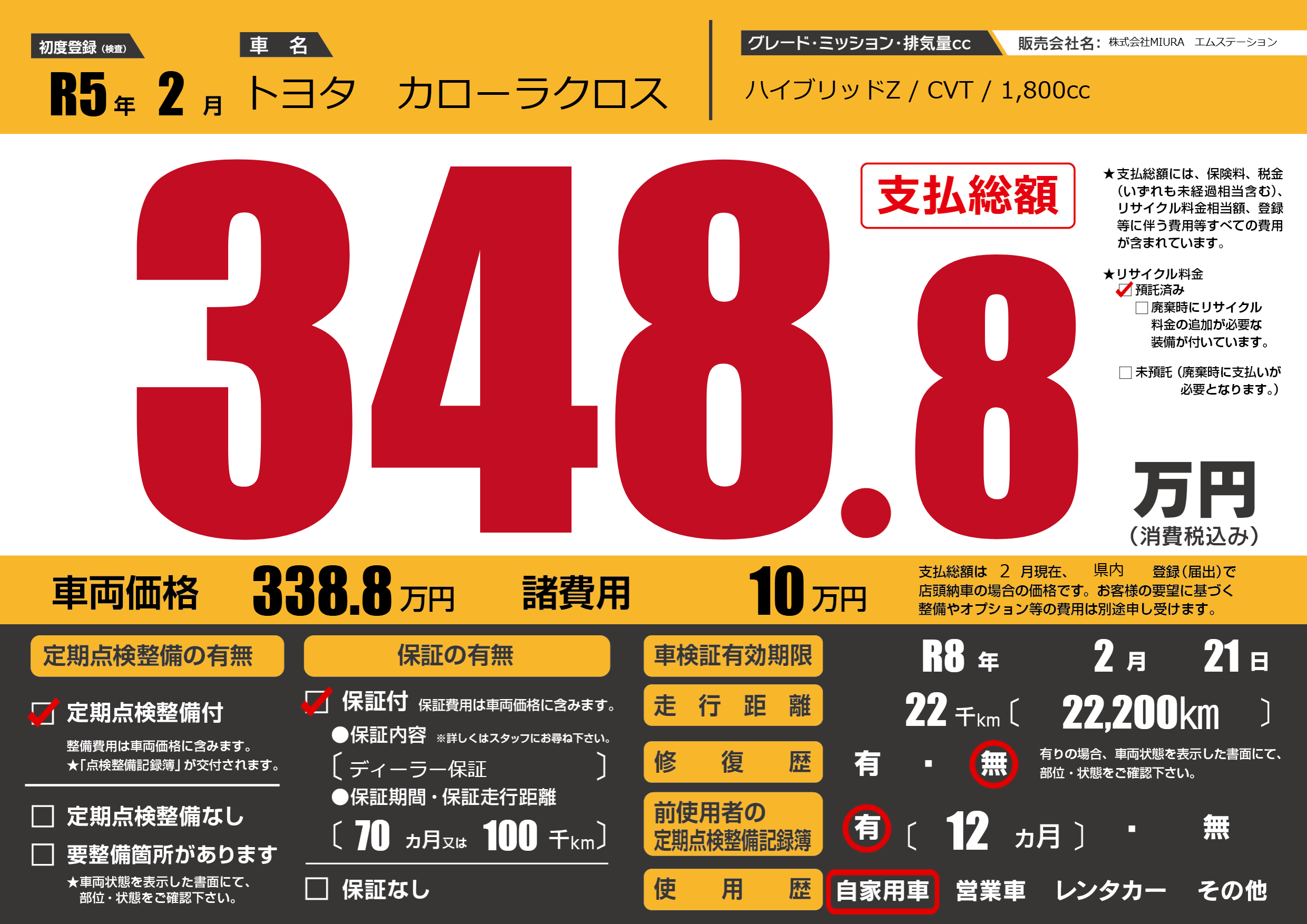 | 走行キロ | 2.2万km | 初年度登録 | R5年2月 |