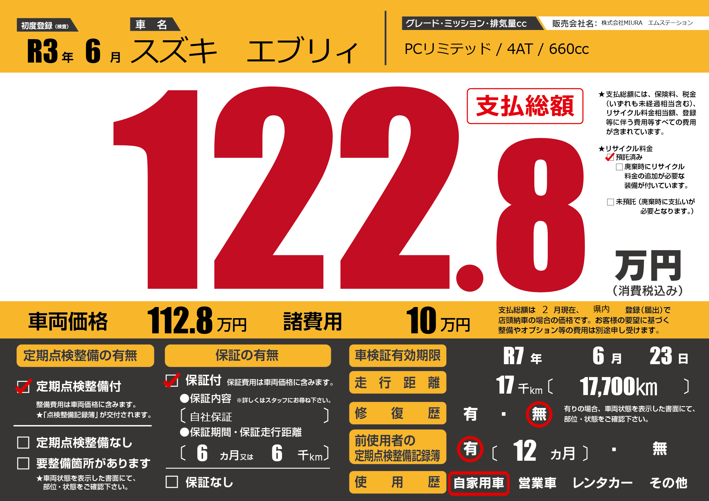 | 走行キロ | 1.7万km | 初年度登録 | R3年6月 |