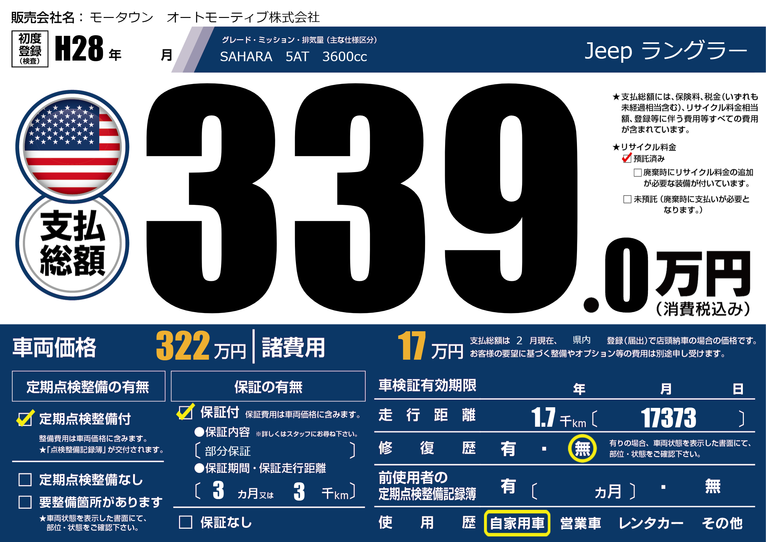 | 車名 | Jeep ラングラー | グレード ミッション 排気量 |