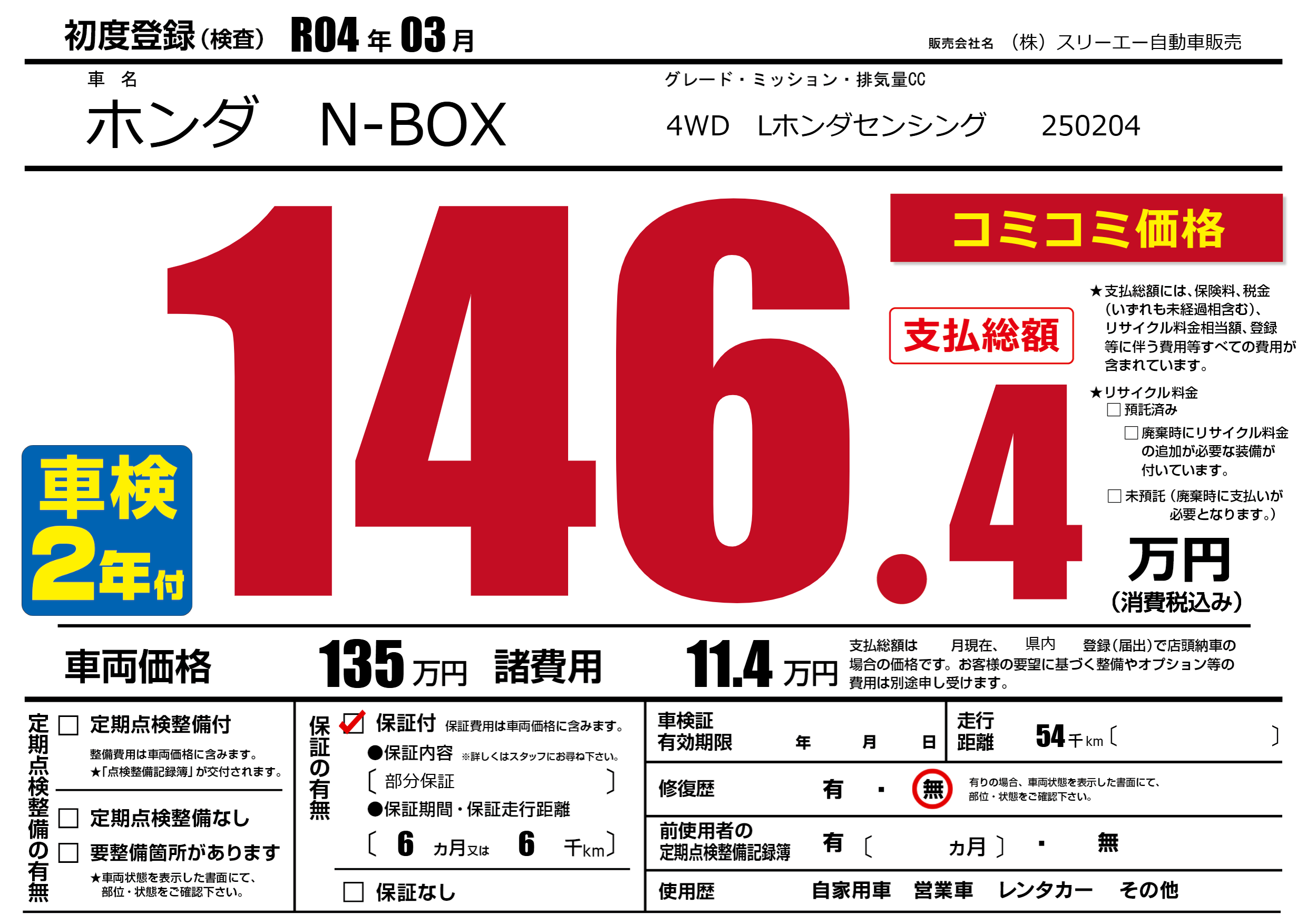 保証付き 保証内容(部分保証) 6ヶ月または(6)千kmまで |