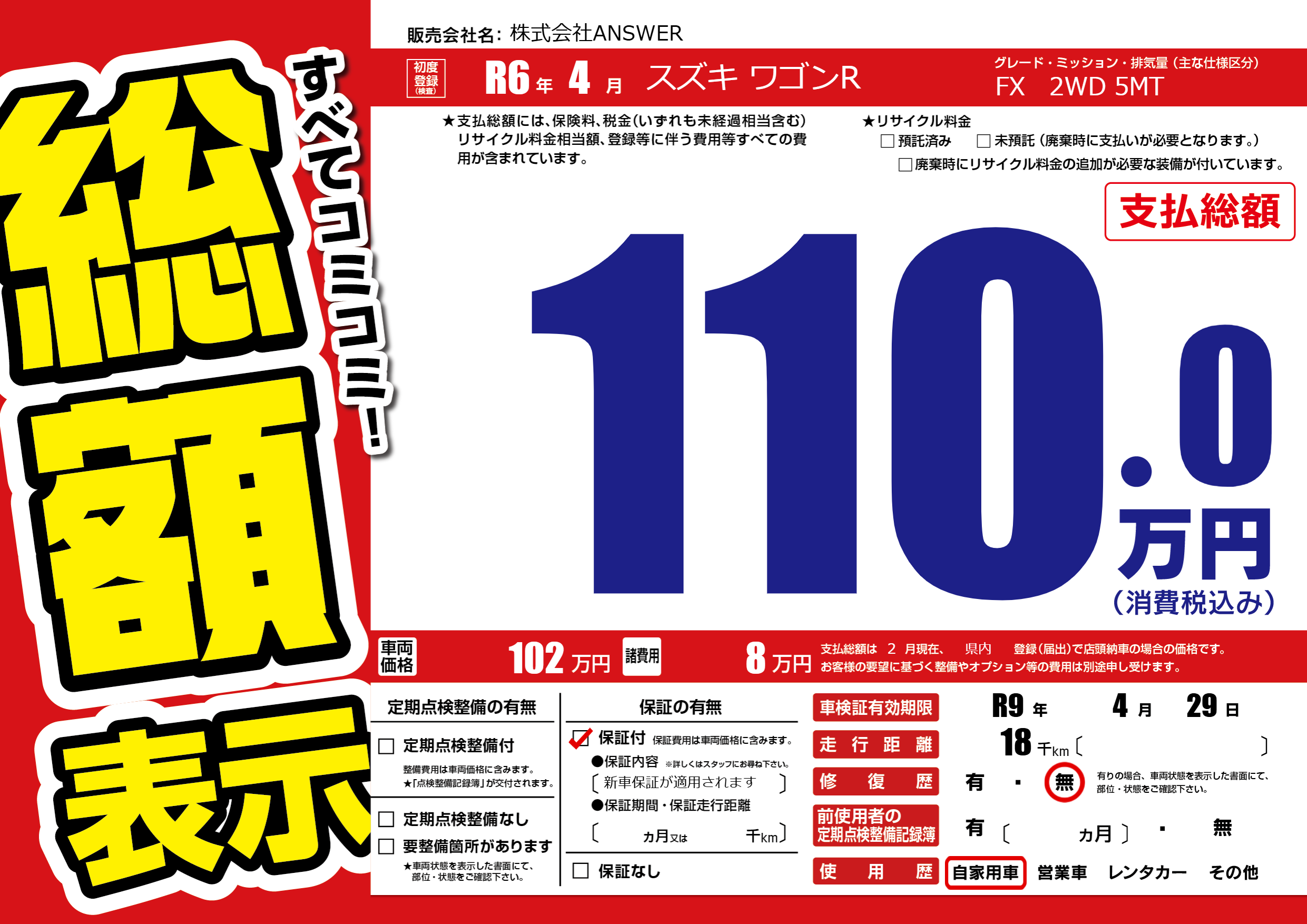 | 車名 | スズキ ワゴンR | グレード ミッション 排気量 |
