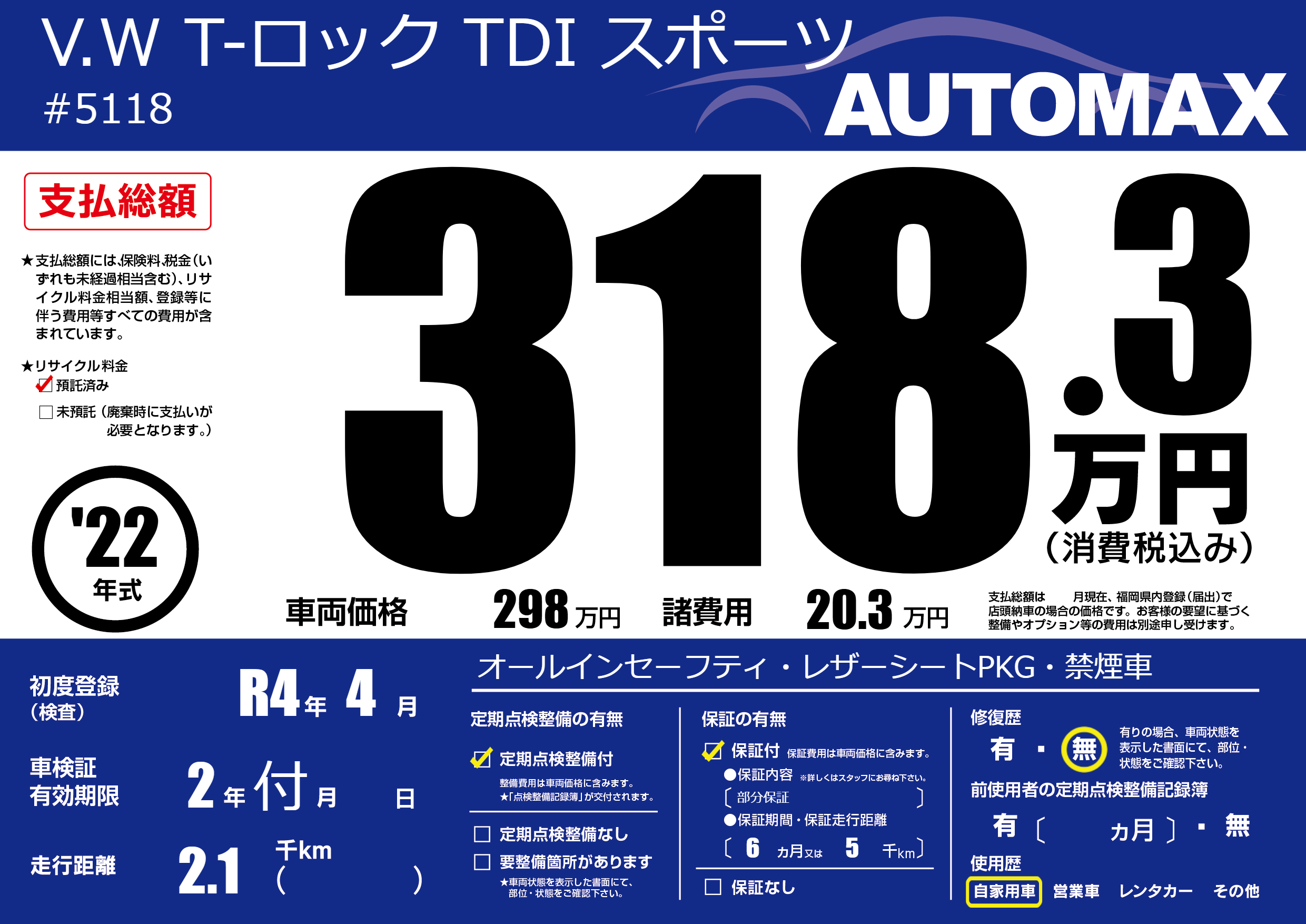 | 車名 | V.W T-ロック TDI スポーツ | グレード ミッション 排気量 |