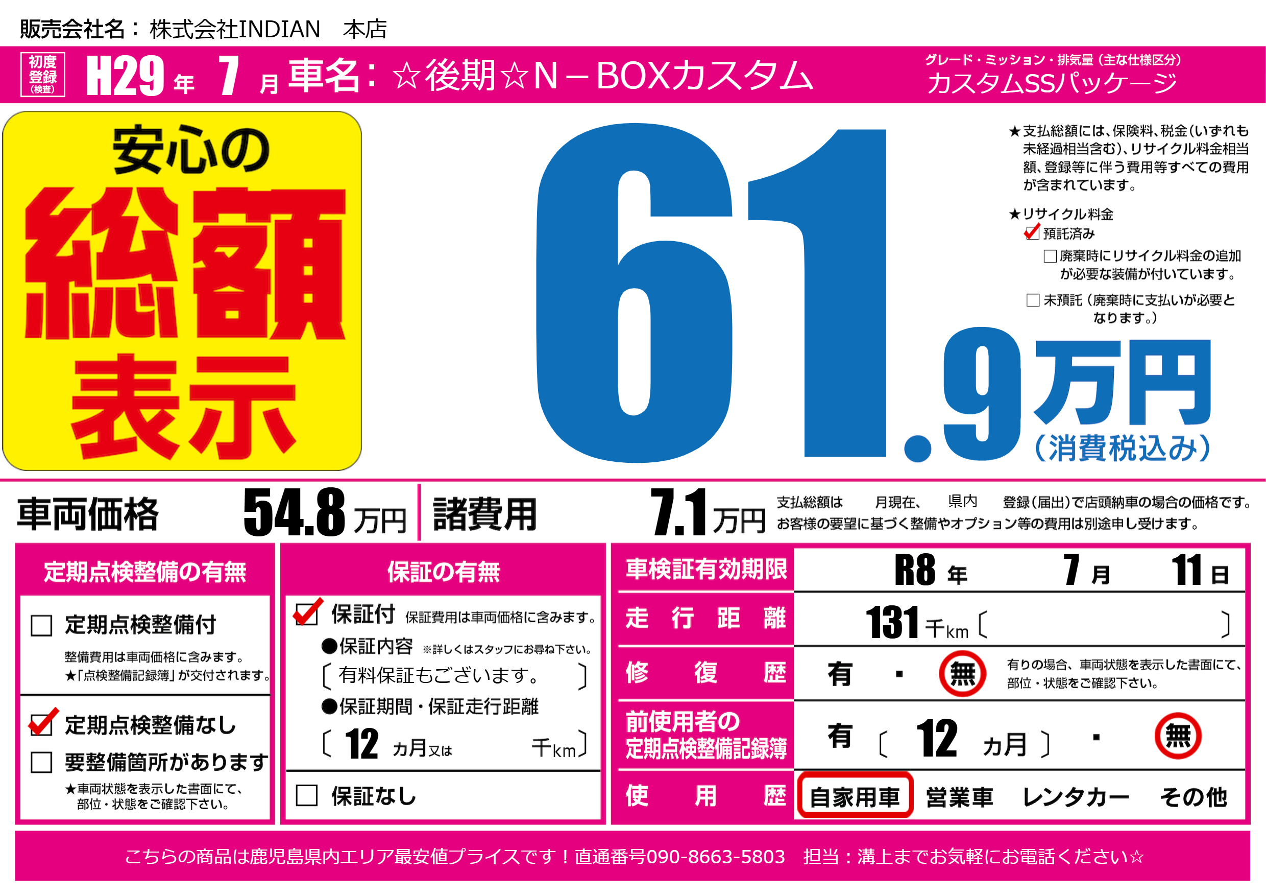 | 車名 | ☆後期☆N-BOXカスタム | グレード ミッション 排気量 |