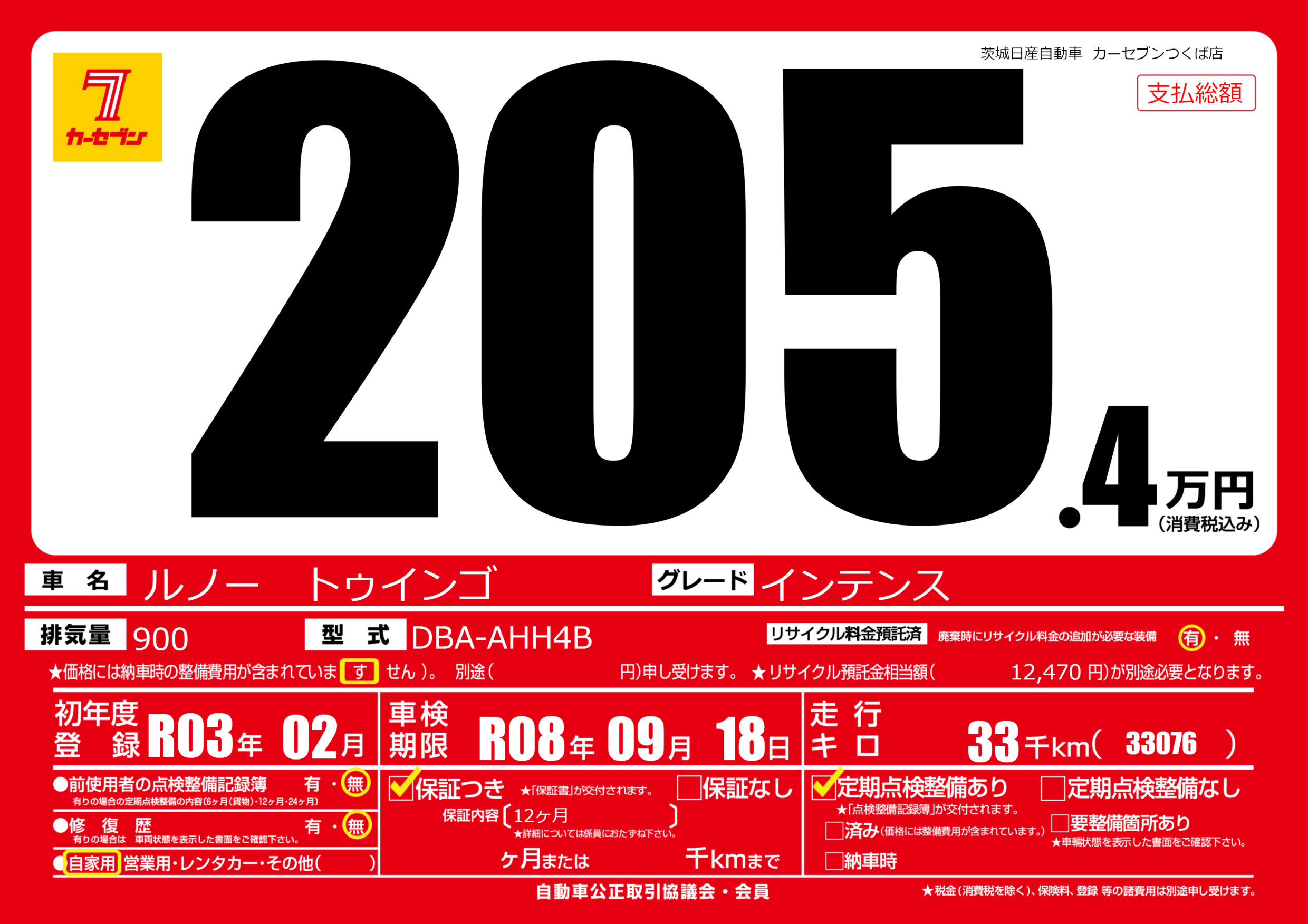 | 車名 | ルノー トゥインゴ | グレード ミッション 排気量 |