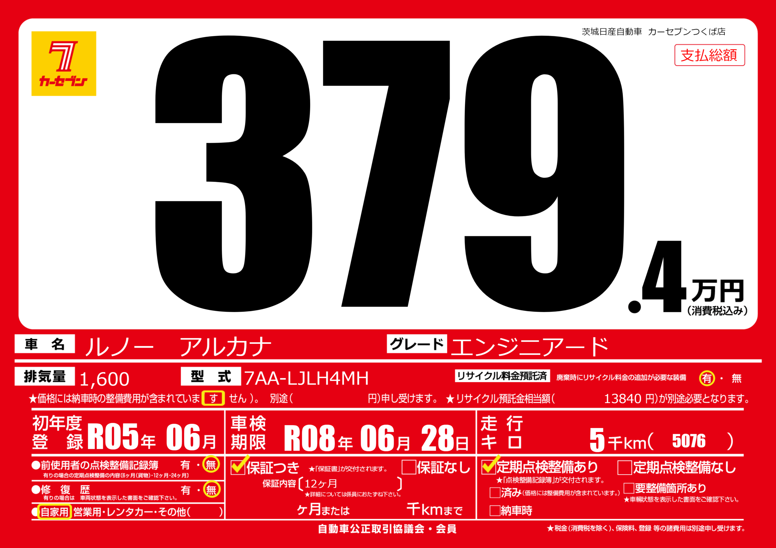 保証付き 保証内容(12ヶ月) ---ヶ月または()千kmまで |