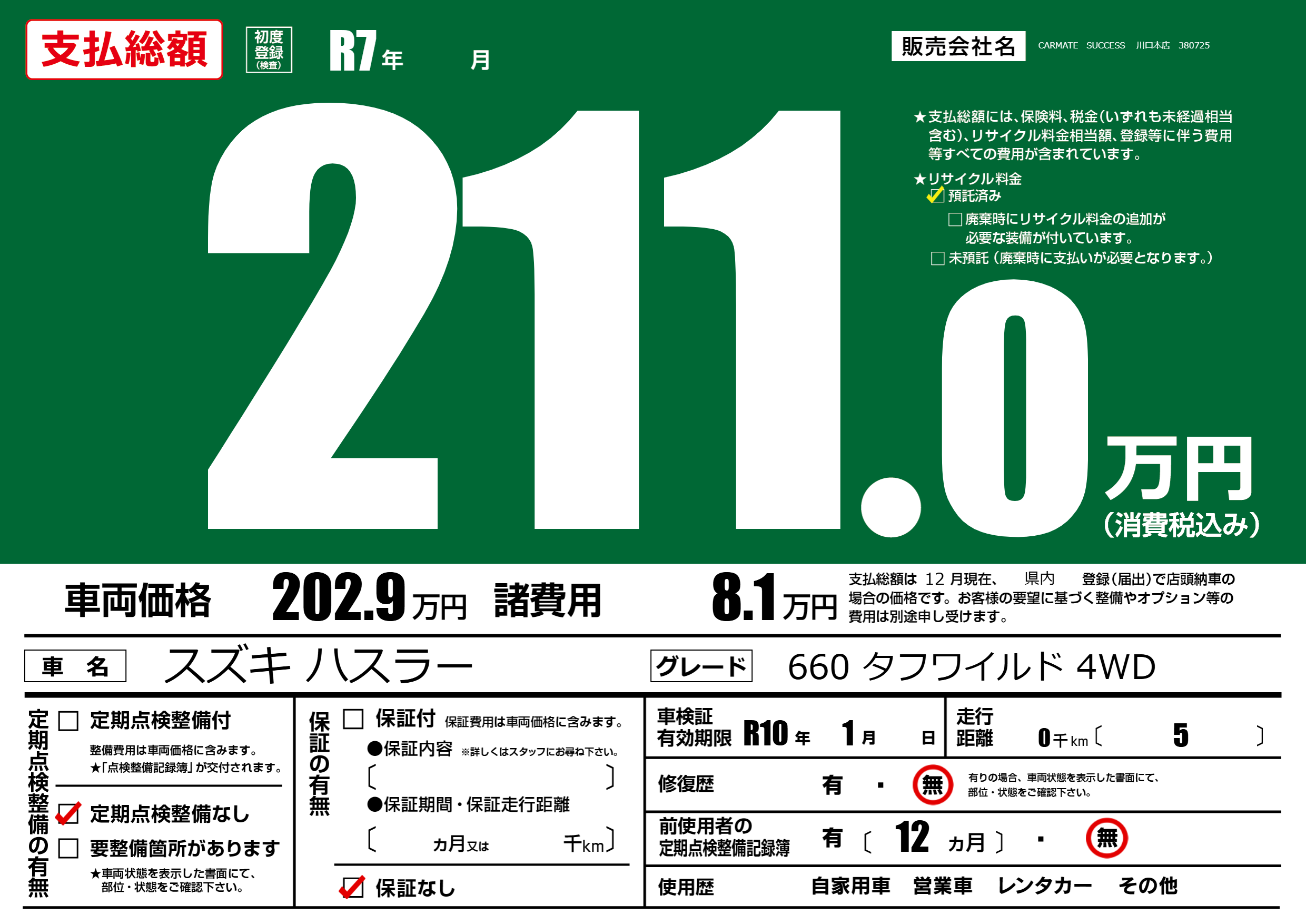 なし | 車検制限 | R10年1月---月 |