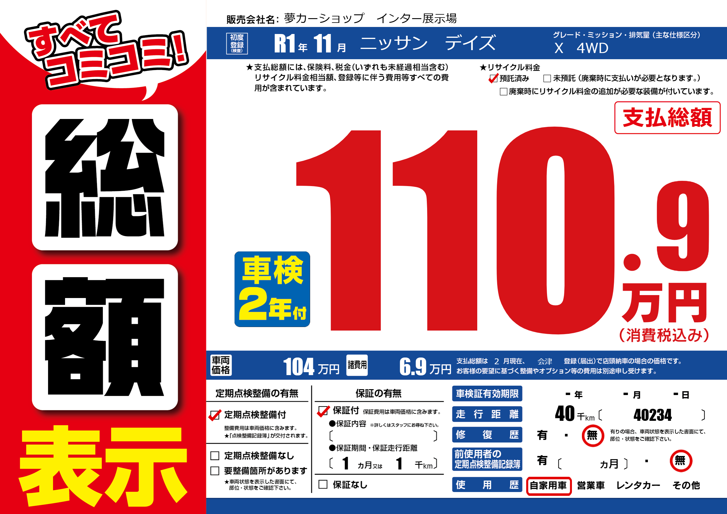 | 車名 | ニッサン デイズ | グレード ミッション 排気量 |
