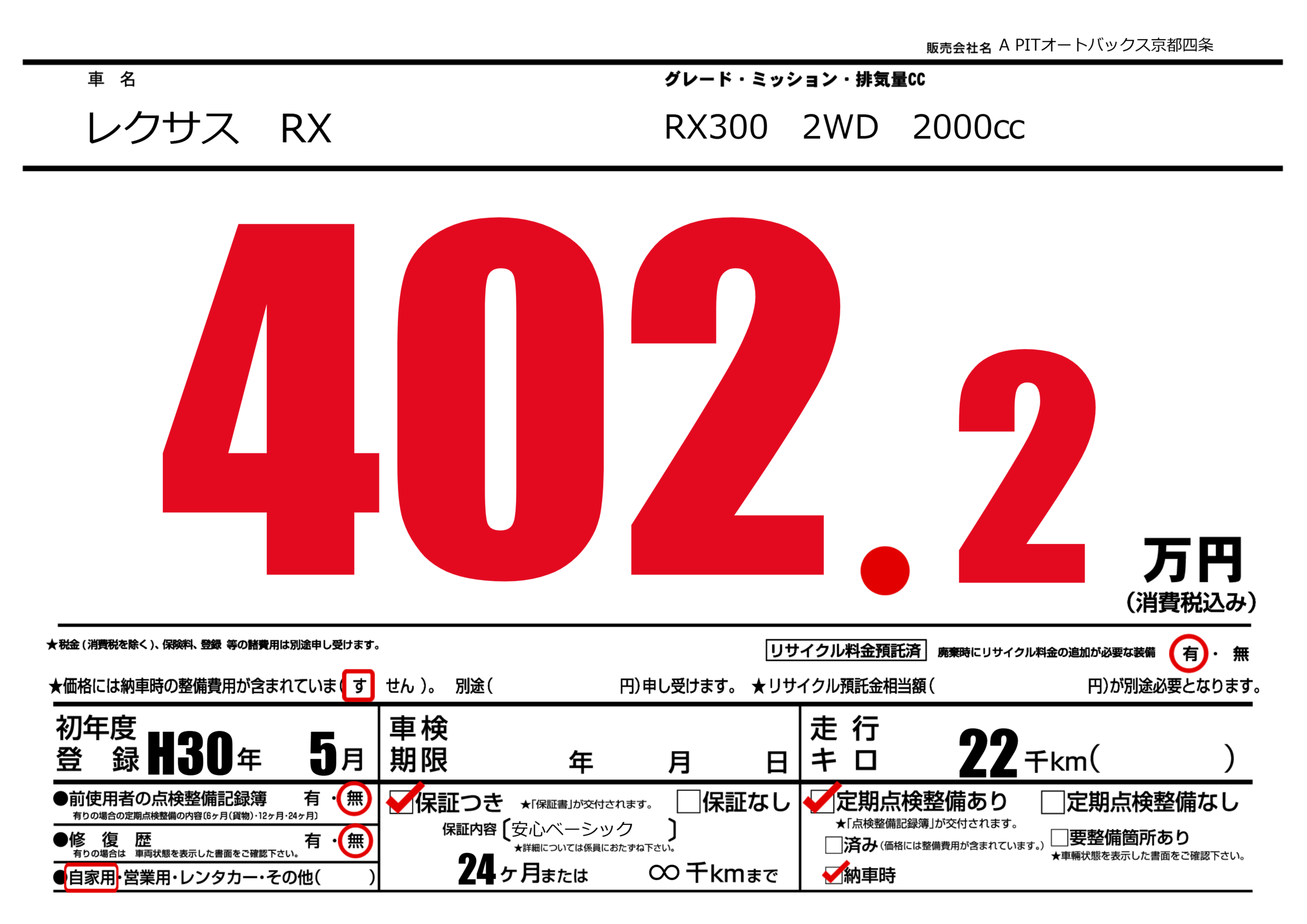 | 車名 | レクサス RX | グレード ミッション 排気量 |