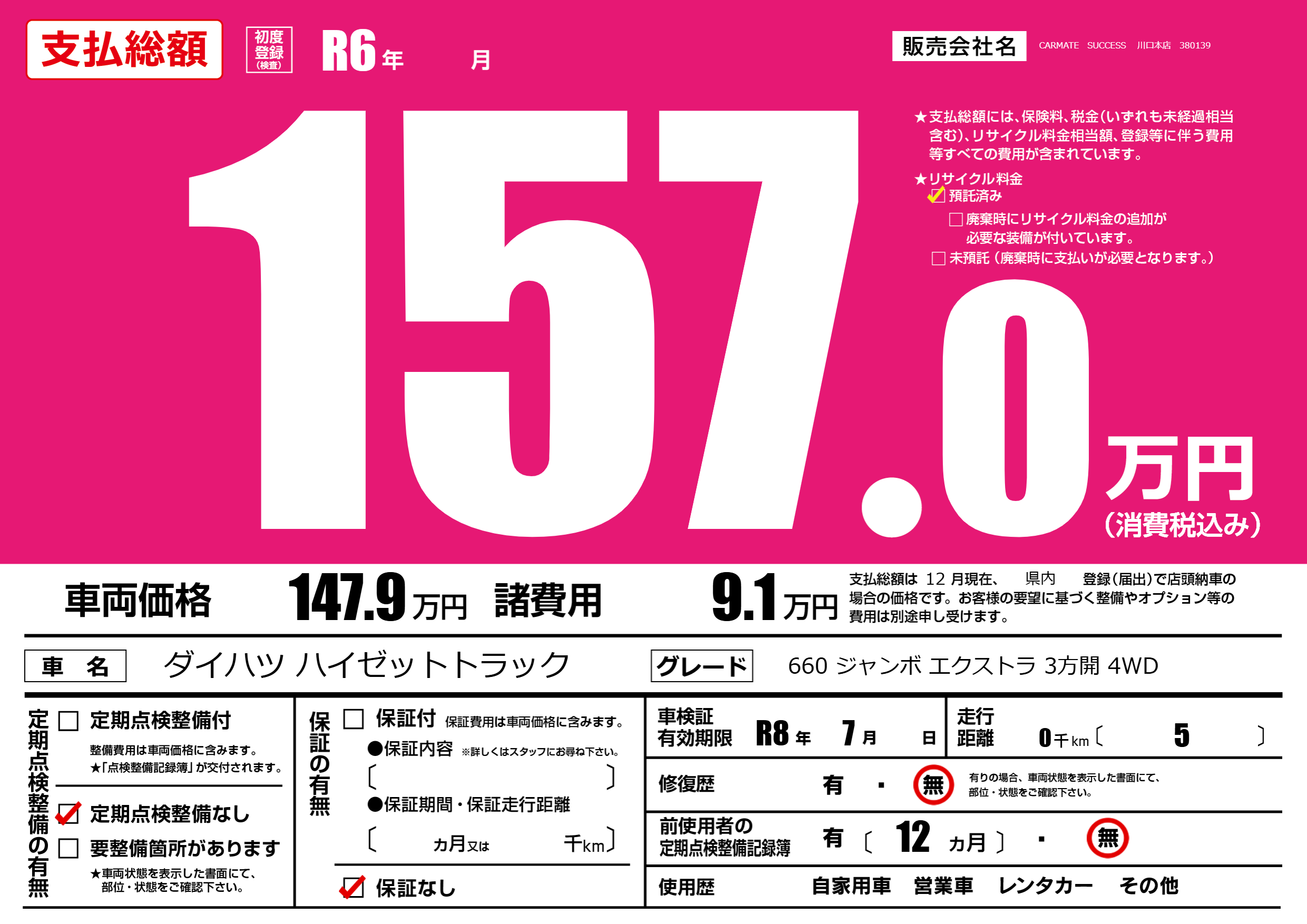 | 車名 | ダイハツ ハイゼットトラック | グレード ミッション 排気量 |