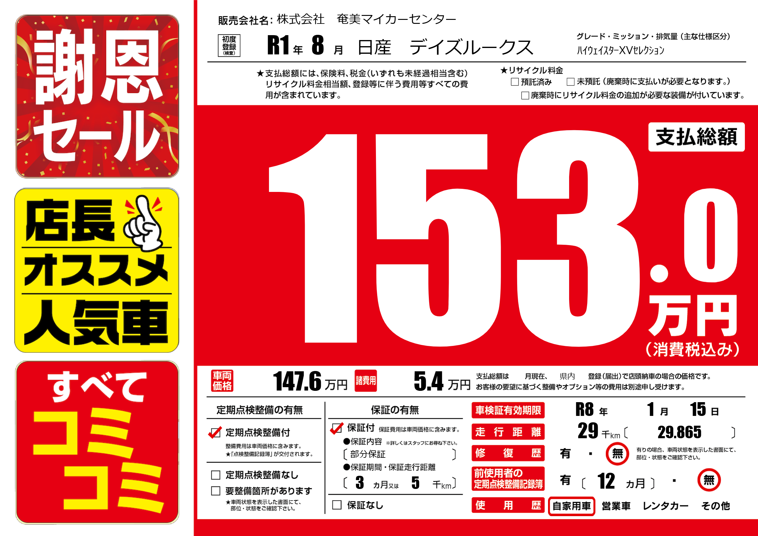 | 車名 | 日産 デイズルークス | グレード ミッション 排気量 |