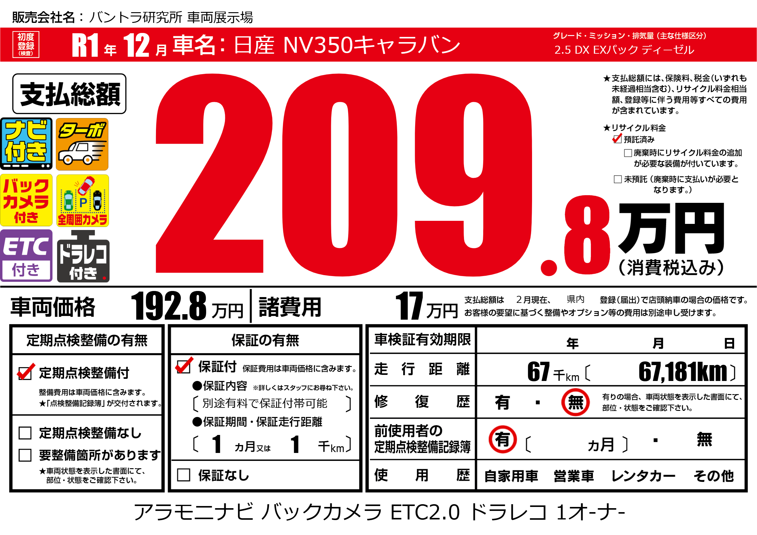 | 車名 | 日産 NV350キャラバン | グレード ミッション 排気量 |