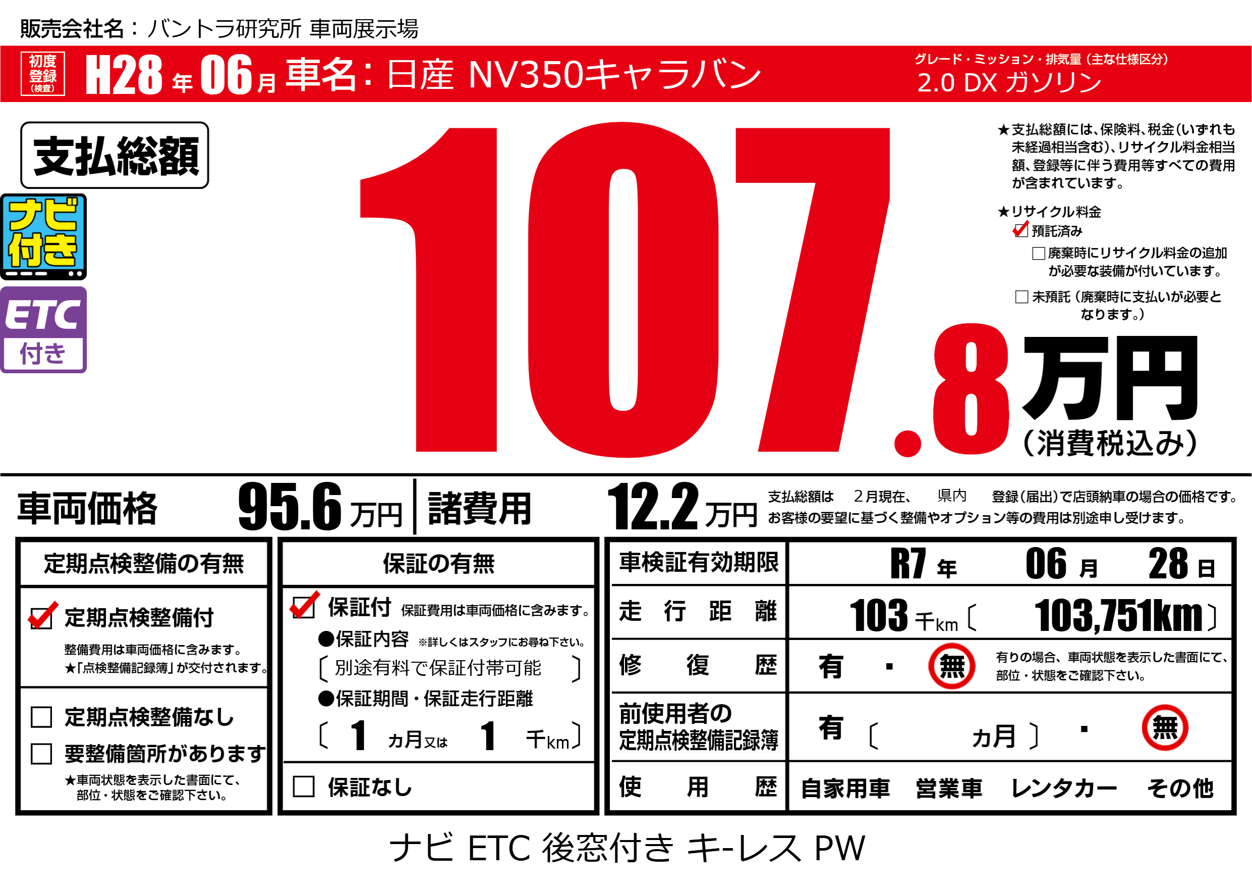 | 車名 | 日産 NV350キャラバン | グレード ミッション 排気量 |