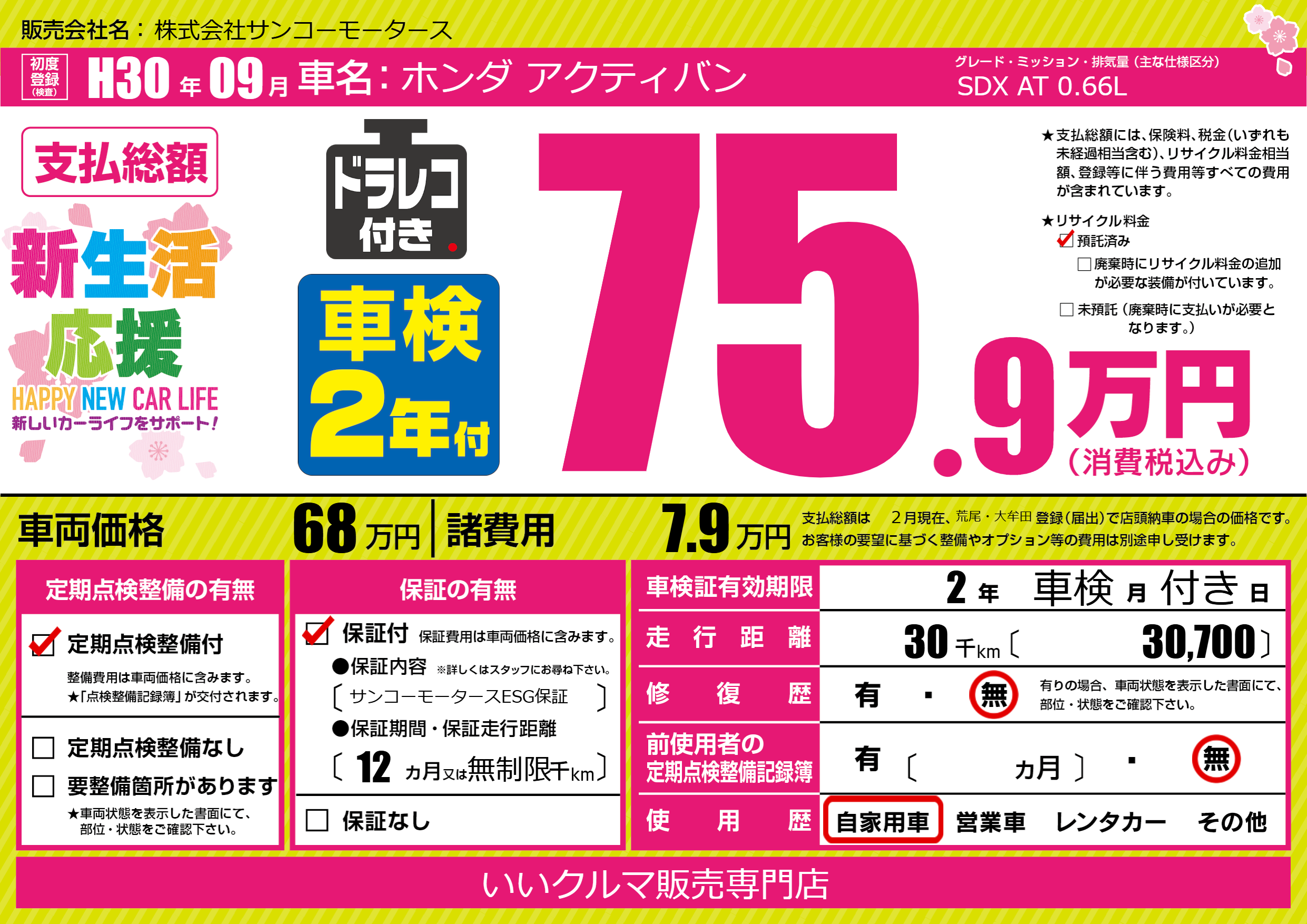 | 走行キロ | 3万km | 初年度登録 | H30年09月 |