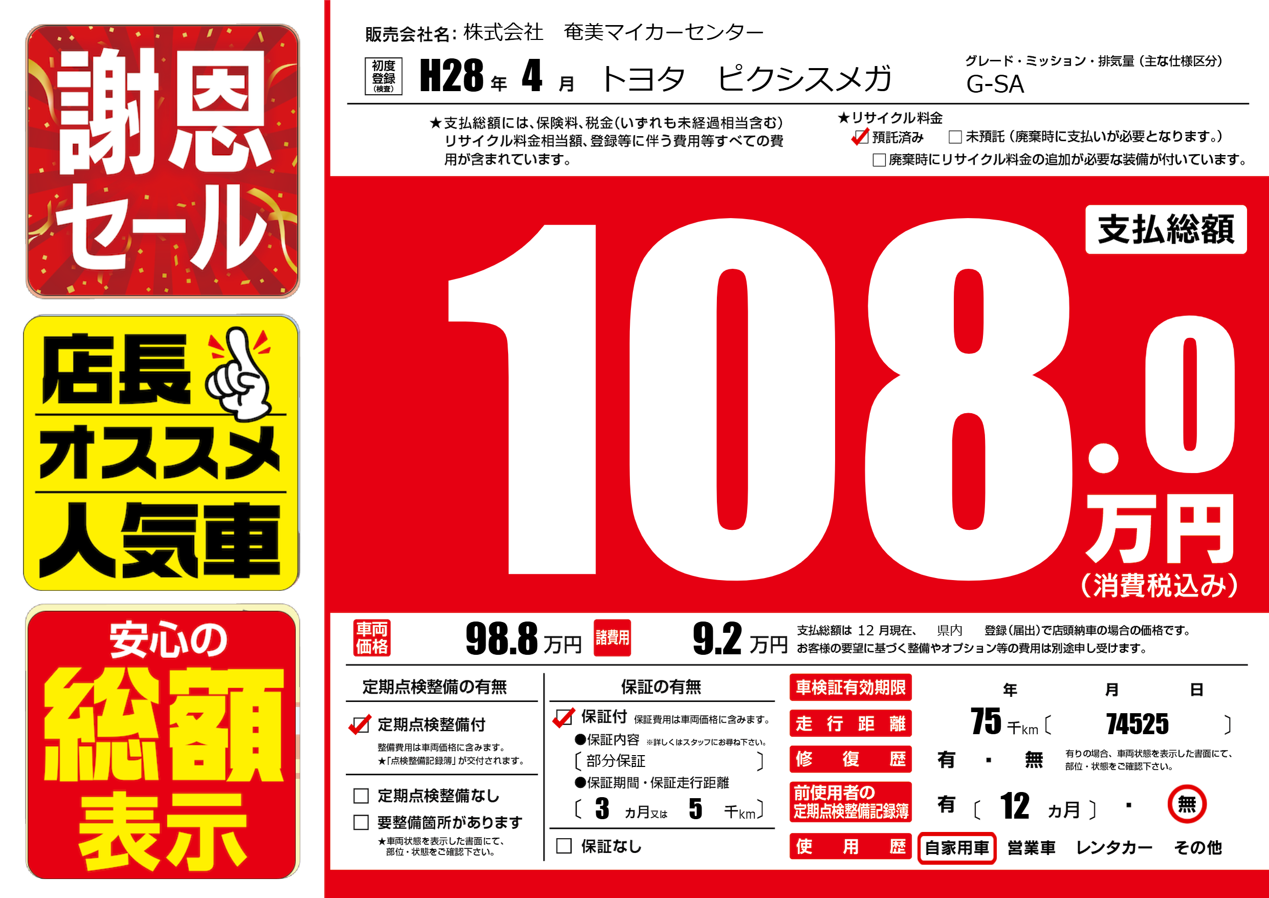 | 走行キロ | 7.5万km | 初年度登録 | H28年4月 |