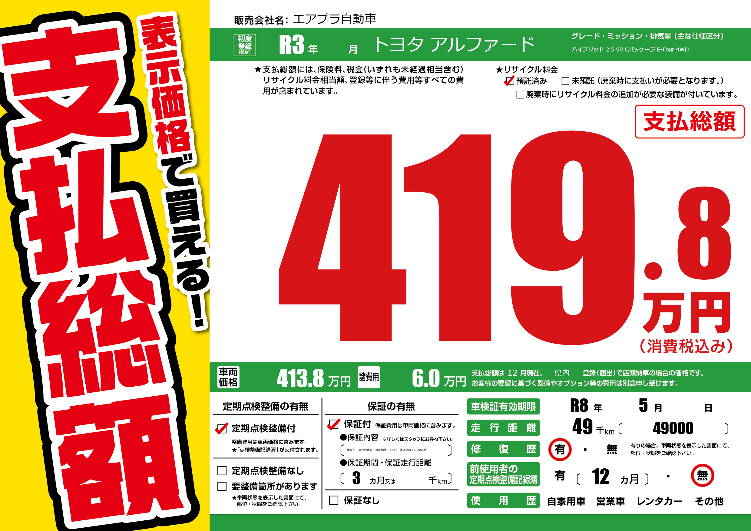 | 車名 | トヨタ アルファード | グレード ミッション 排気量 |