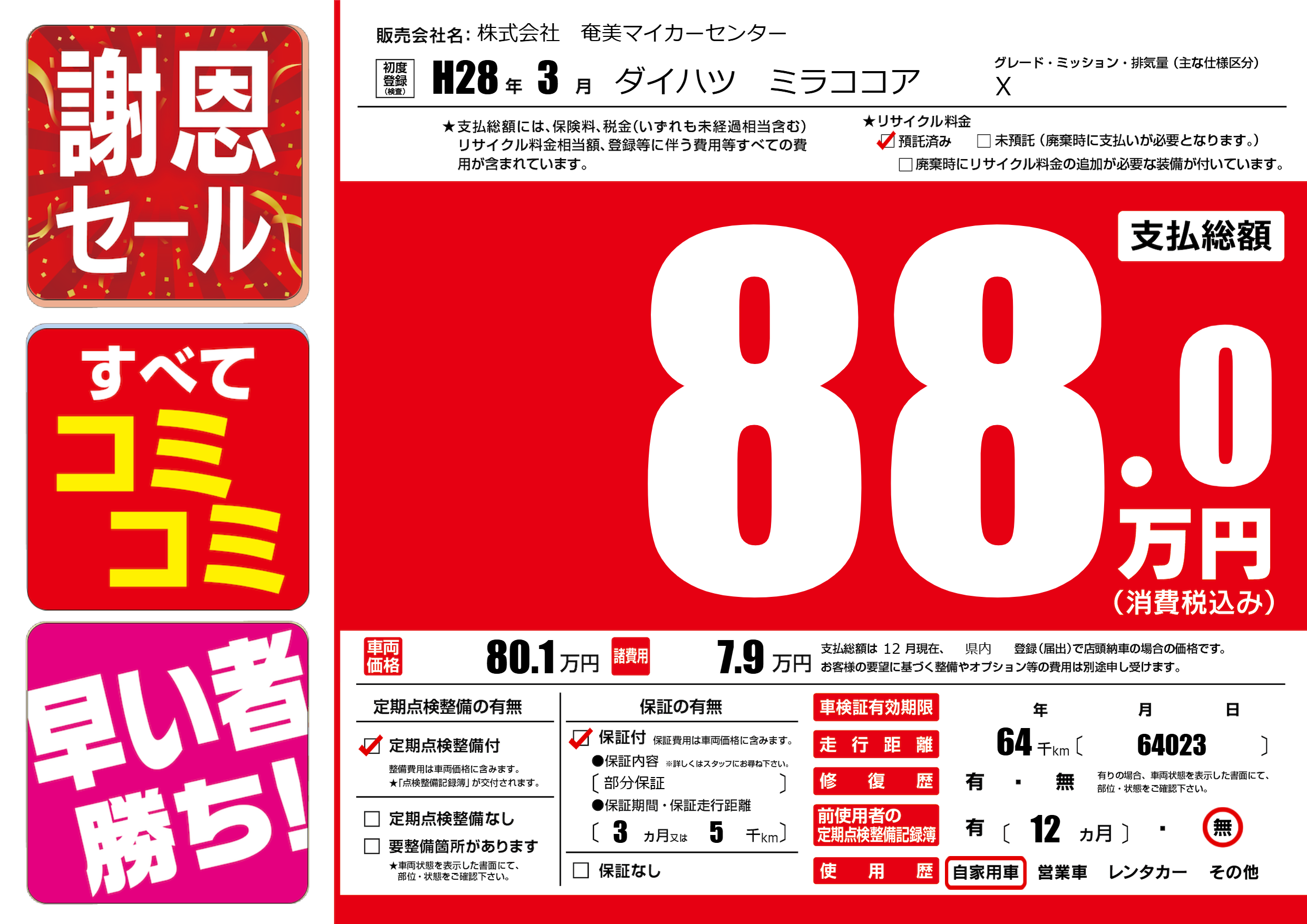 | 車名 | ダイハツ ミラココア | グレード ミッション 排気量 |