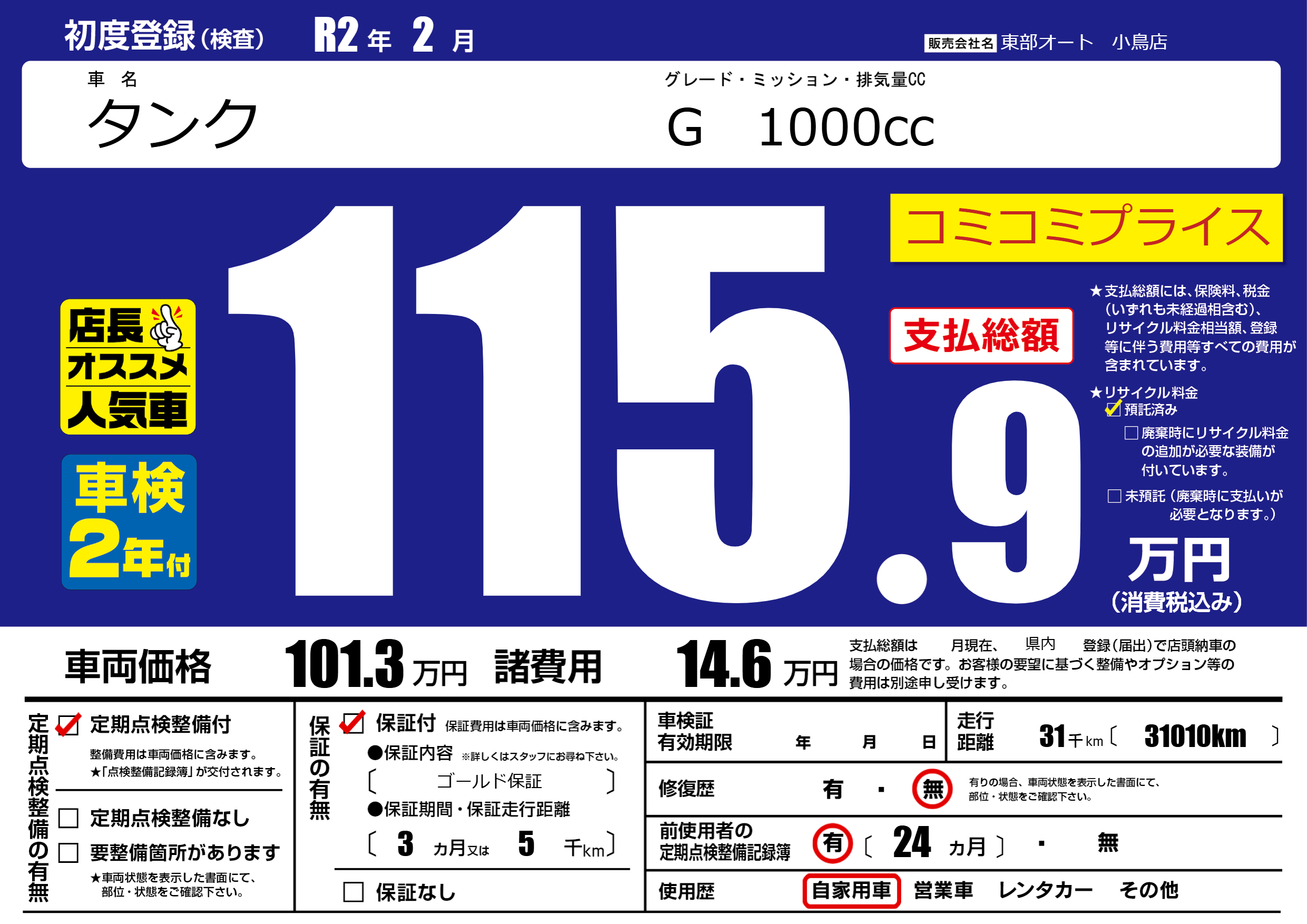 | 走行キロ | 3.1万km | 初年度登録 | R2年2月 |