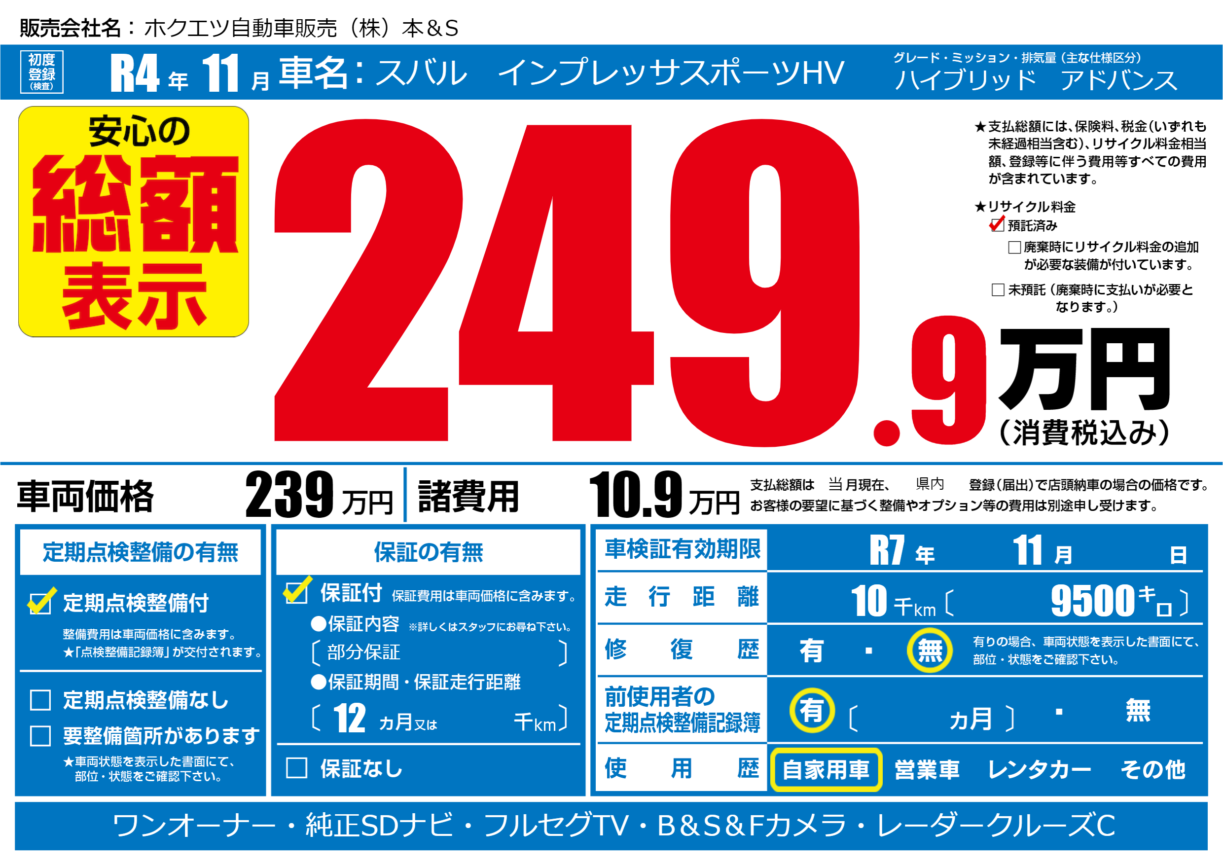 | 車名 | スバル インプレッサスポーツHV | グレード ミッション 排気量 |