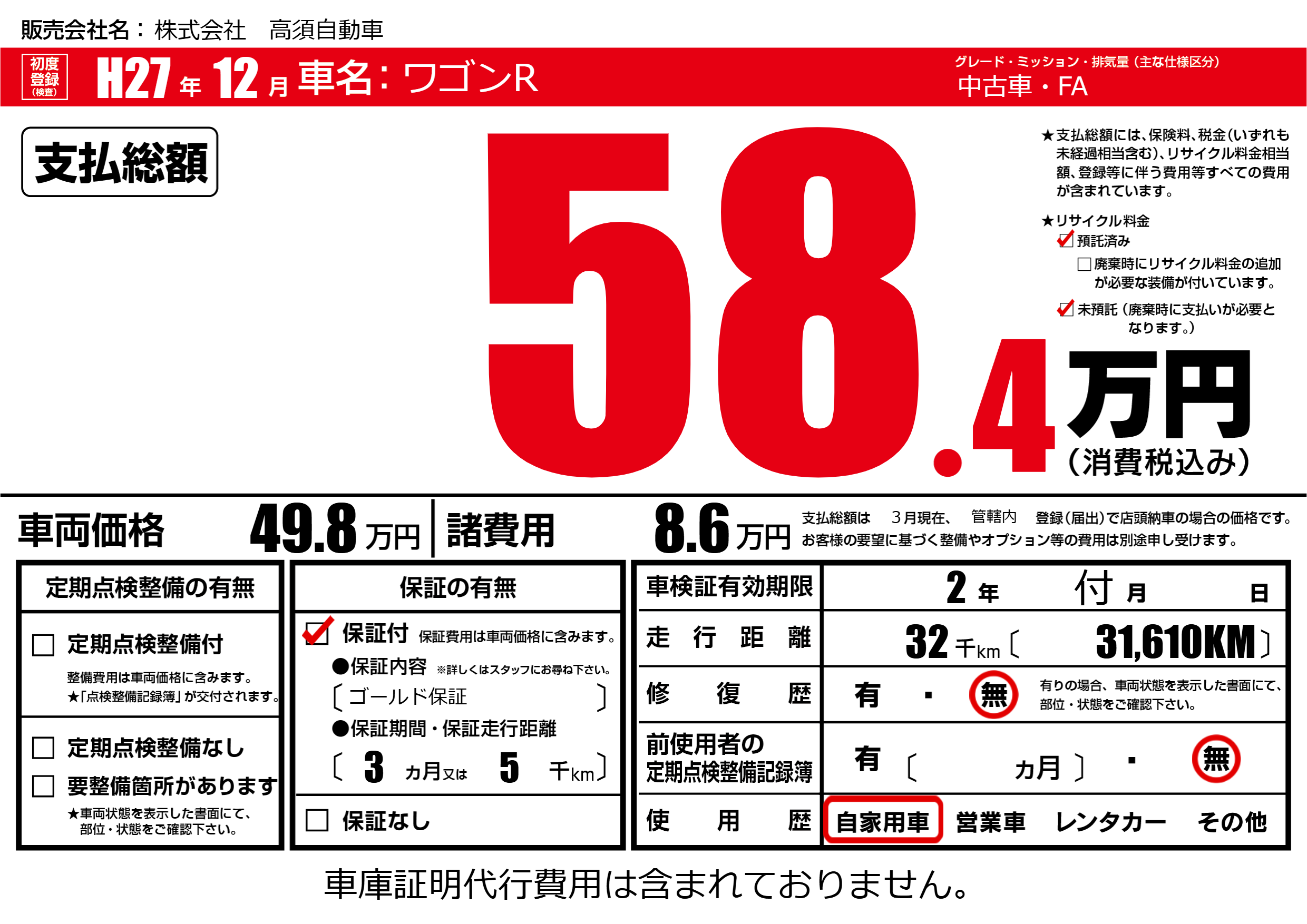 | 車名 | ワゴンR | グレード ミッション 排気量 |