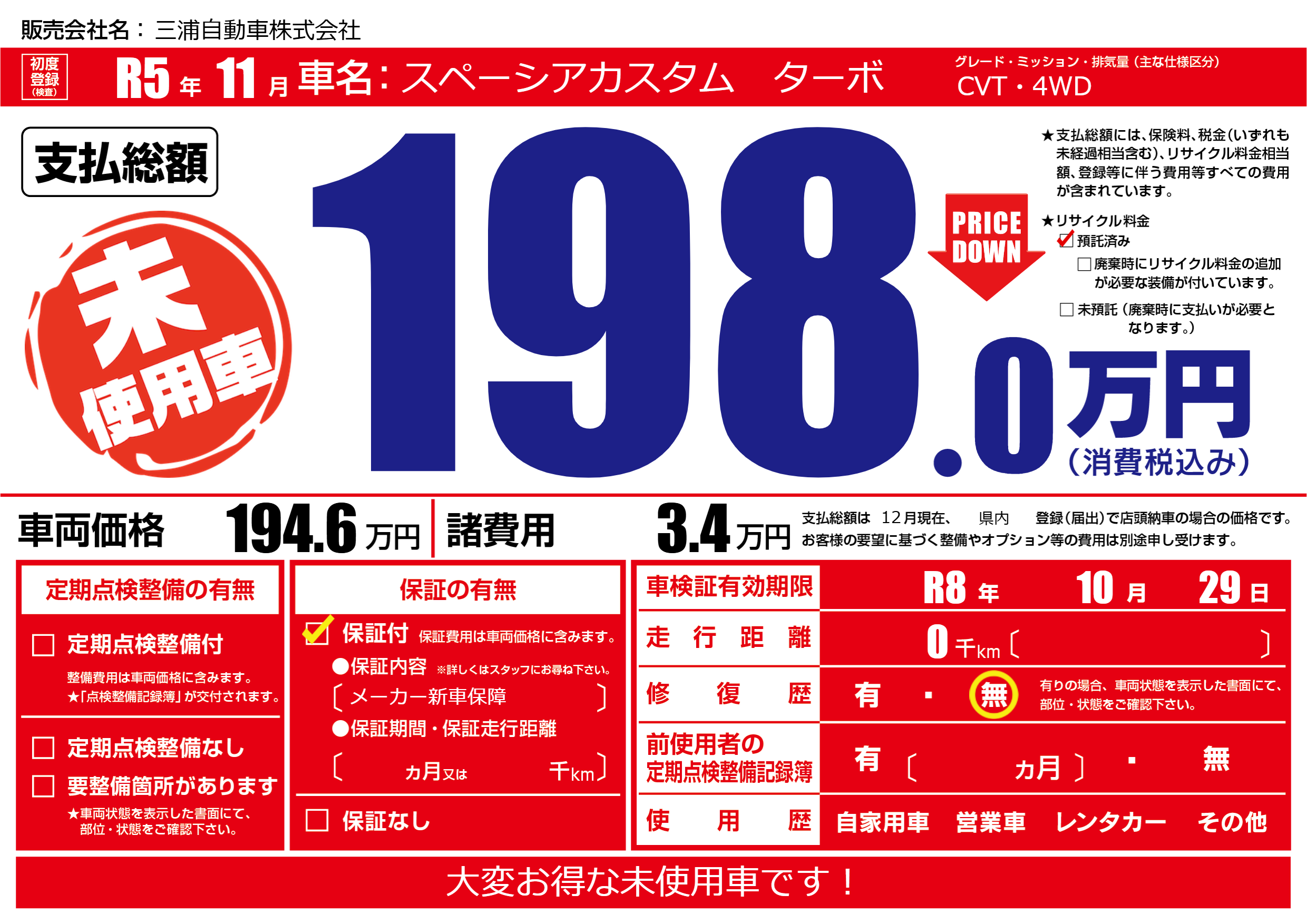 | 車名 | スペーシアカスタム ターボ | グレード ミッション 排気量 |