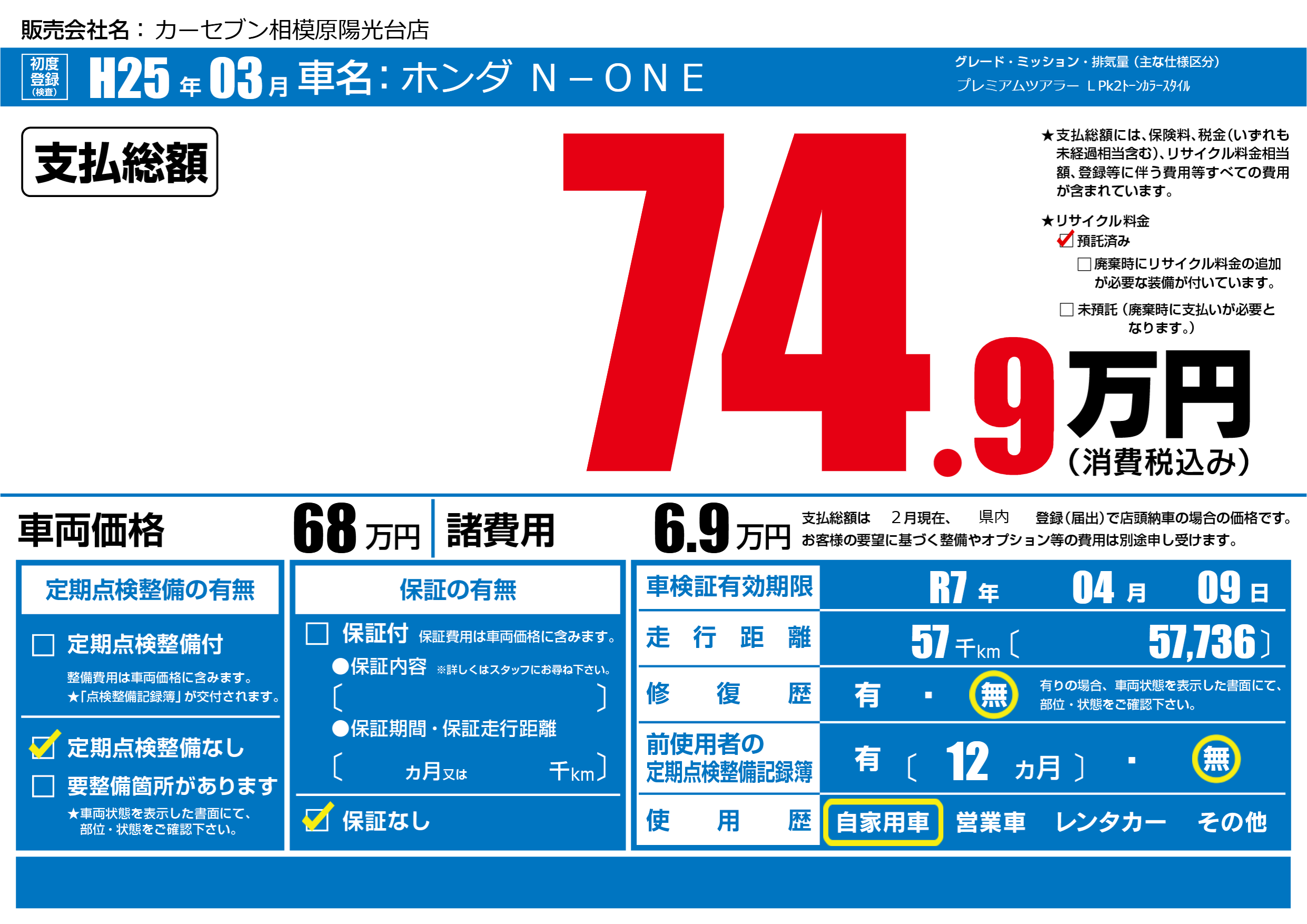 | 車名 | ホンダ N-ONE | グレード ミッション 排気量 |