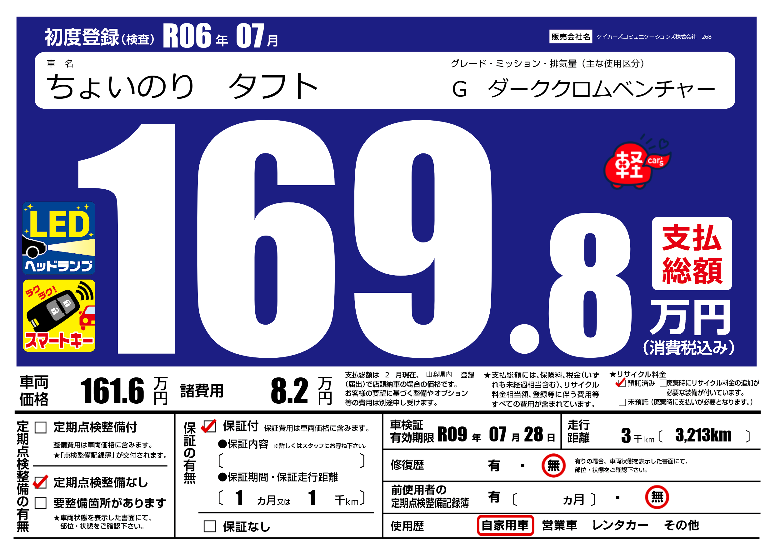 | 走行キロ | 0.3万km | 初年度登録 | R06年07月 |