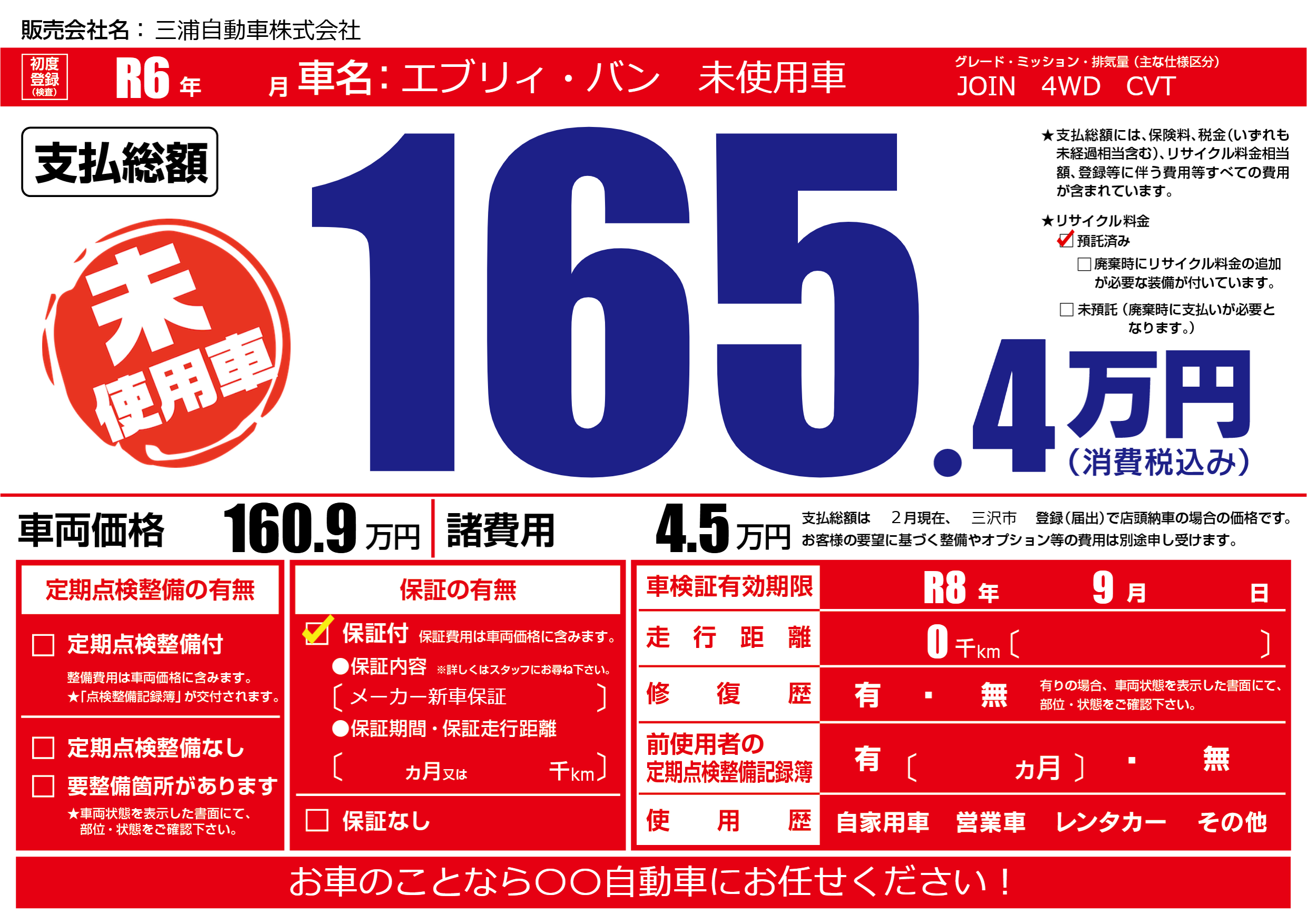 | 車名 | エブリィ・バン 未使用車 | グレード ミッション 排気量 |