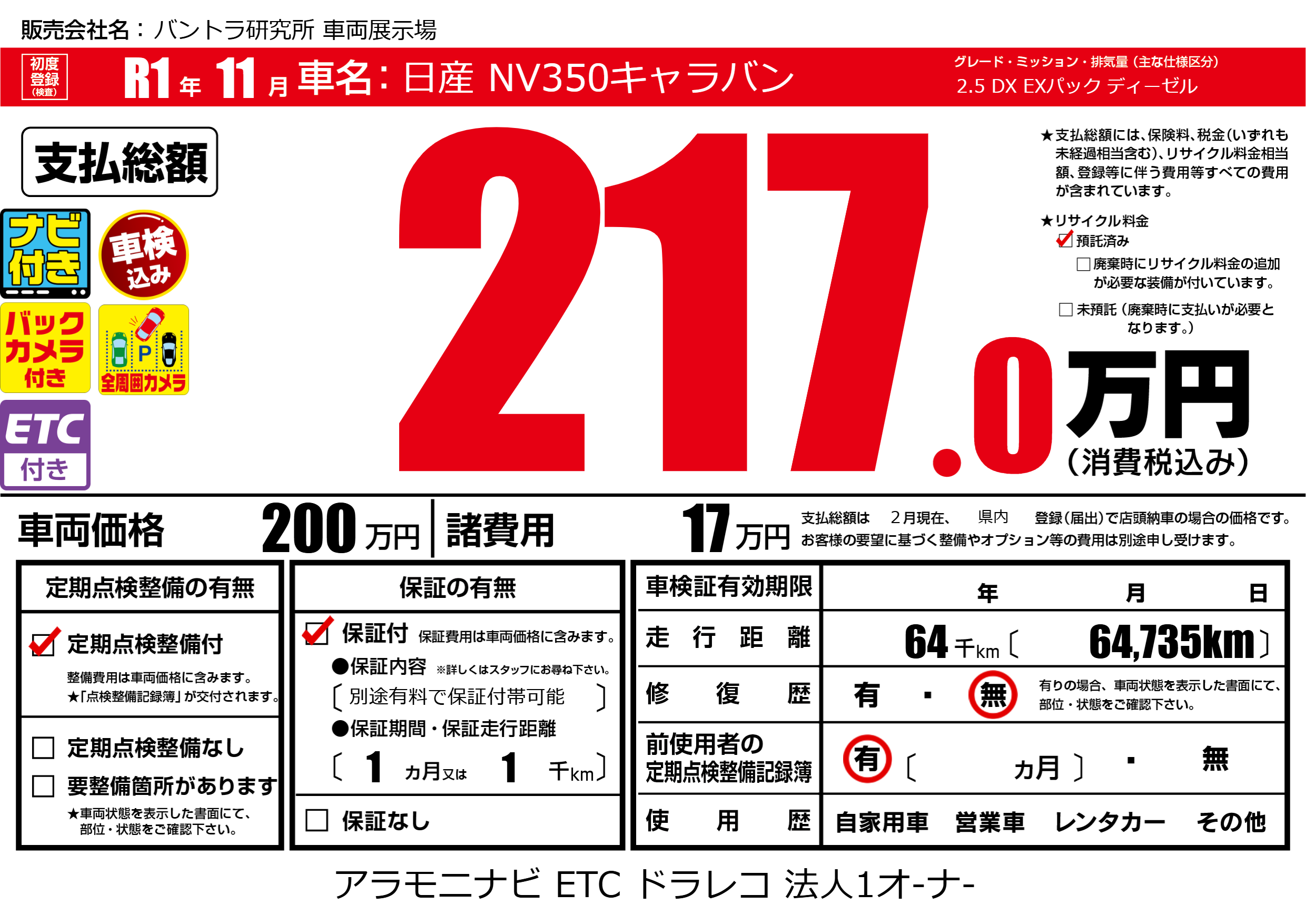 | 車名 | 日産 NV350キャラバン | グレード ミッション 排気量 |