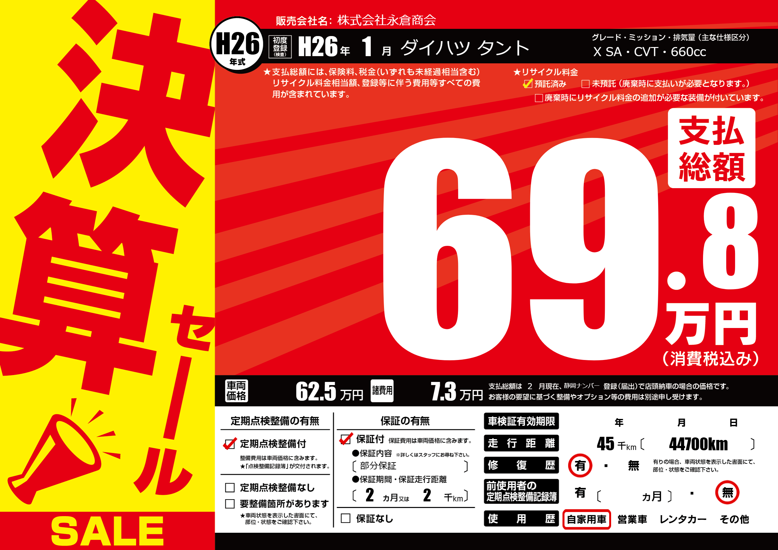 | 車名 | ダイハツ タント | グレード ミッション 排気量 |