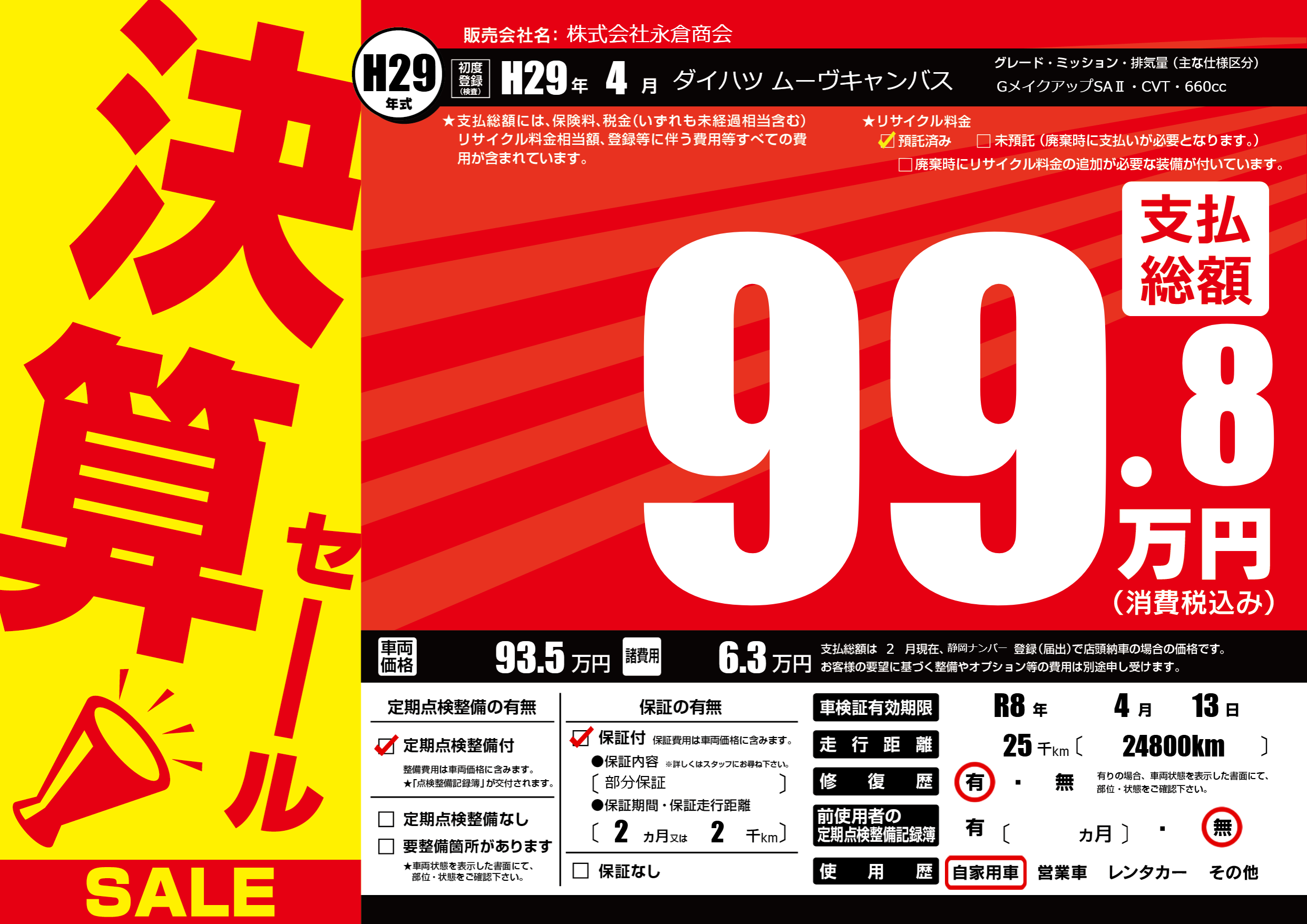 | 走行キロ | 2.5万km | 初年度登録 | H29年4月 |