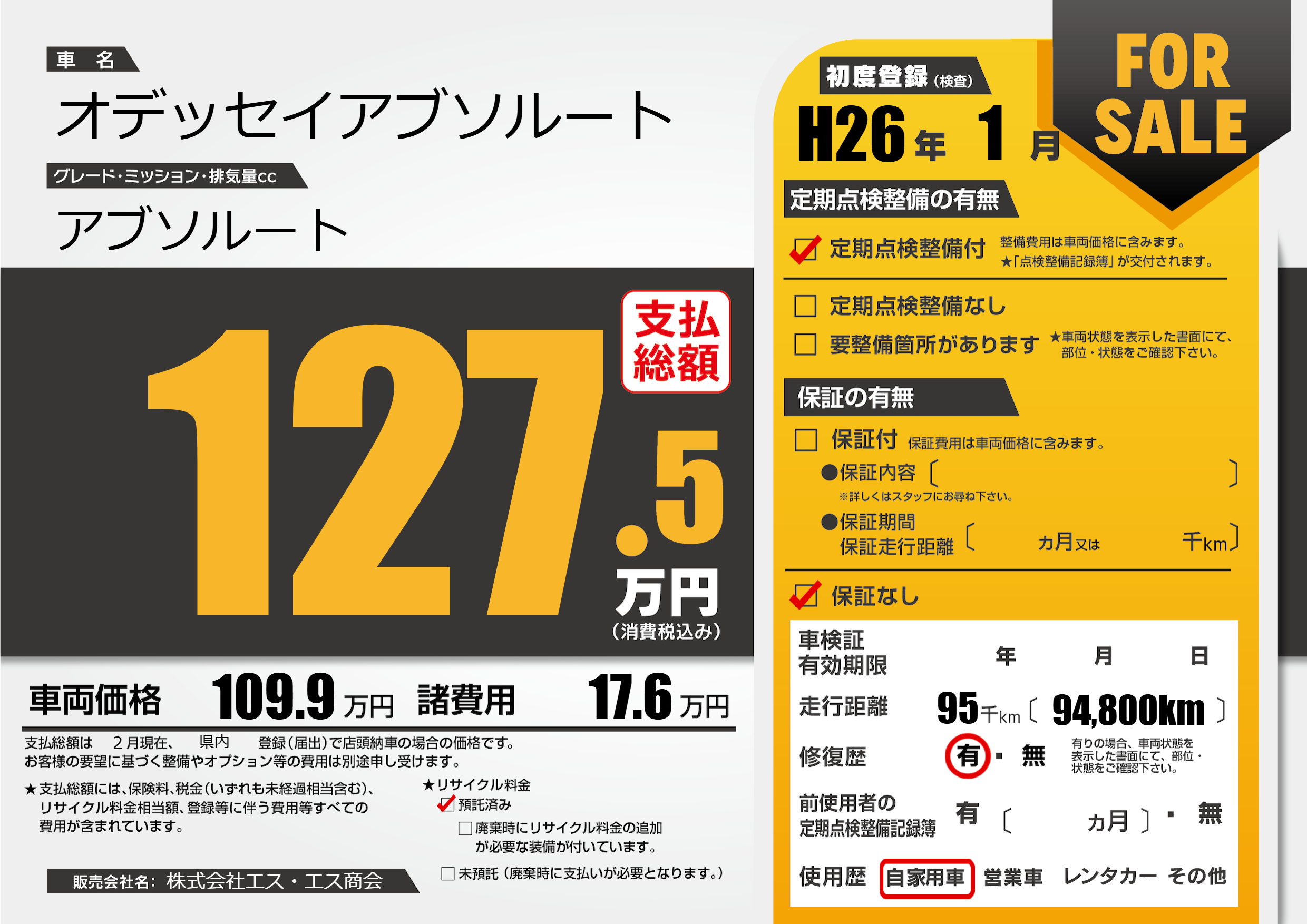 | 走行キロ | 9.5万km | 初年度登録 | H26年1月 |