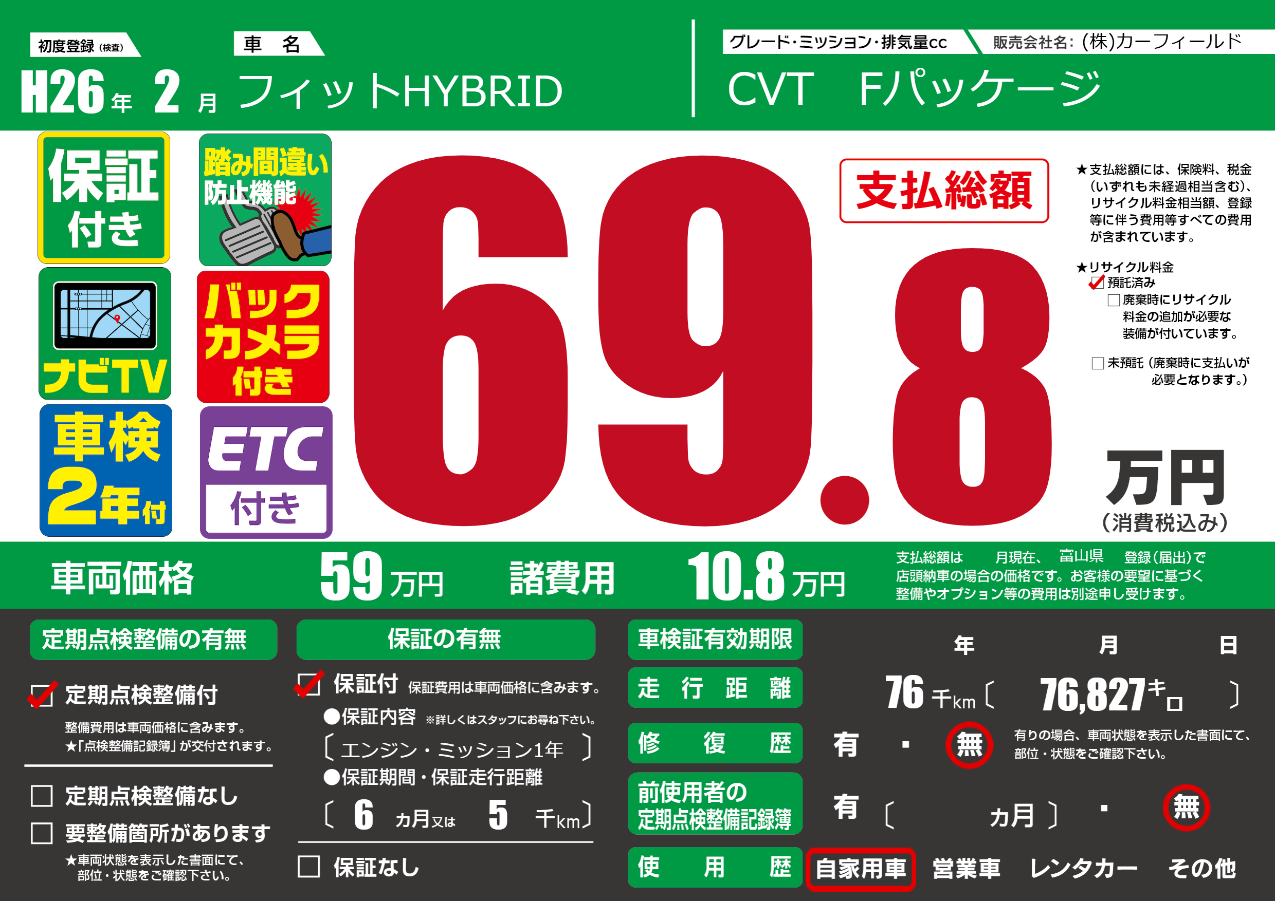 | 車名 | フィットHYBRID | グレード ミッション 排気量 |