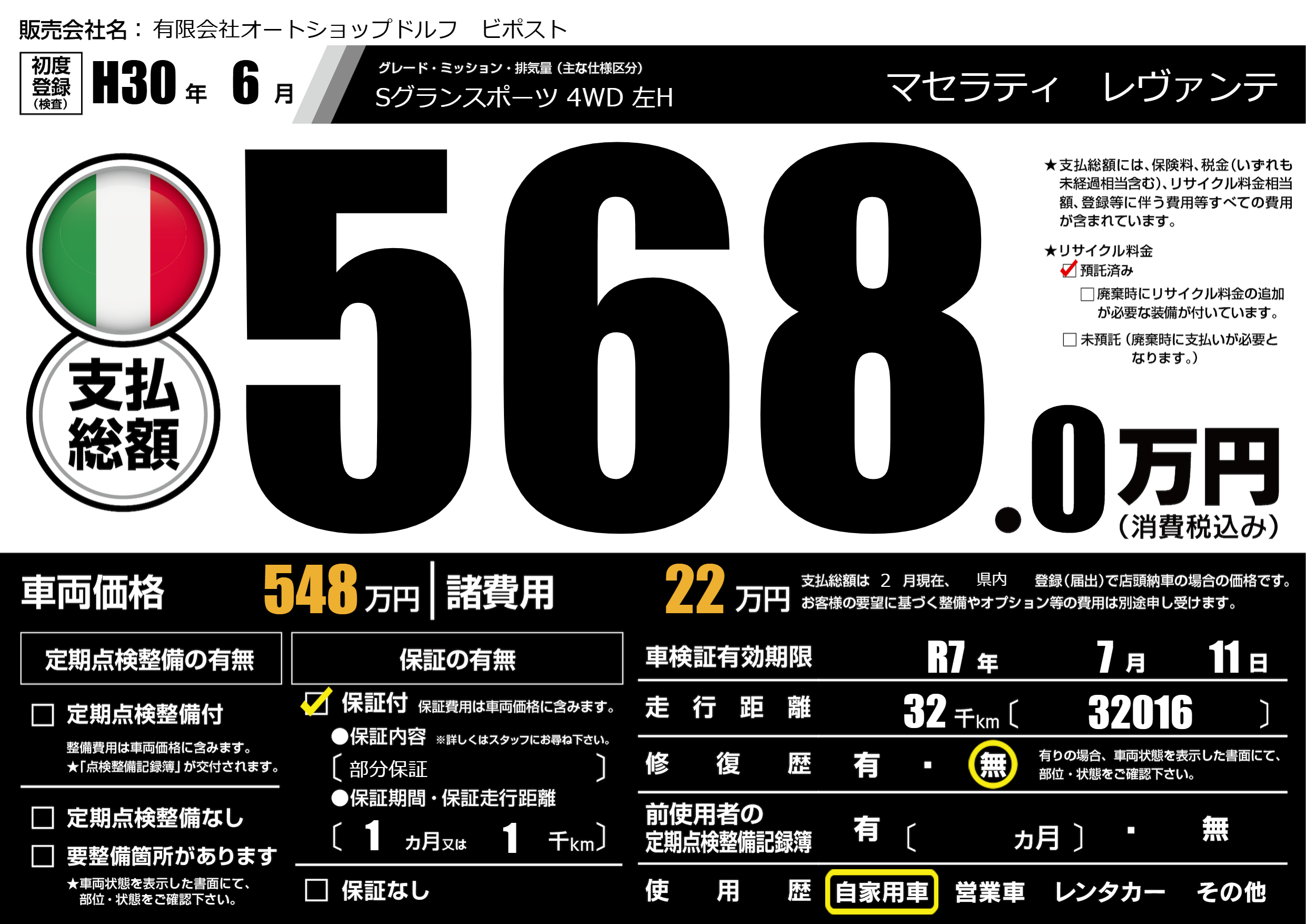| 車名 | マセラティ レヴァンテ | グレード ミッション 排気量 |